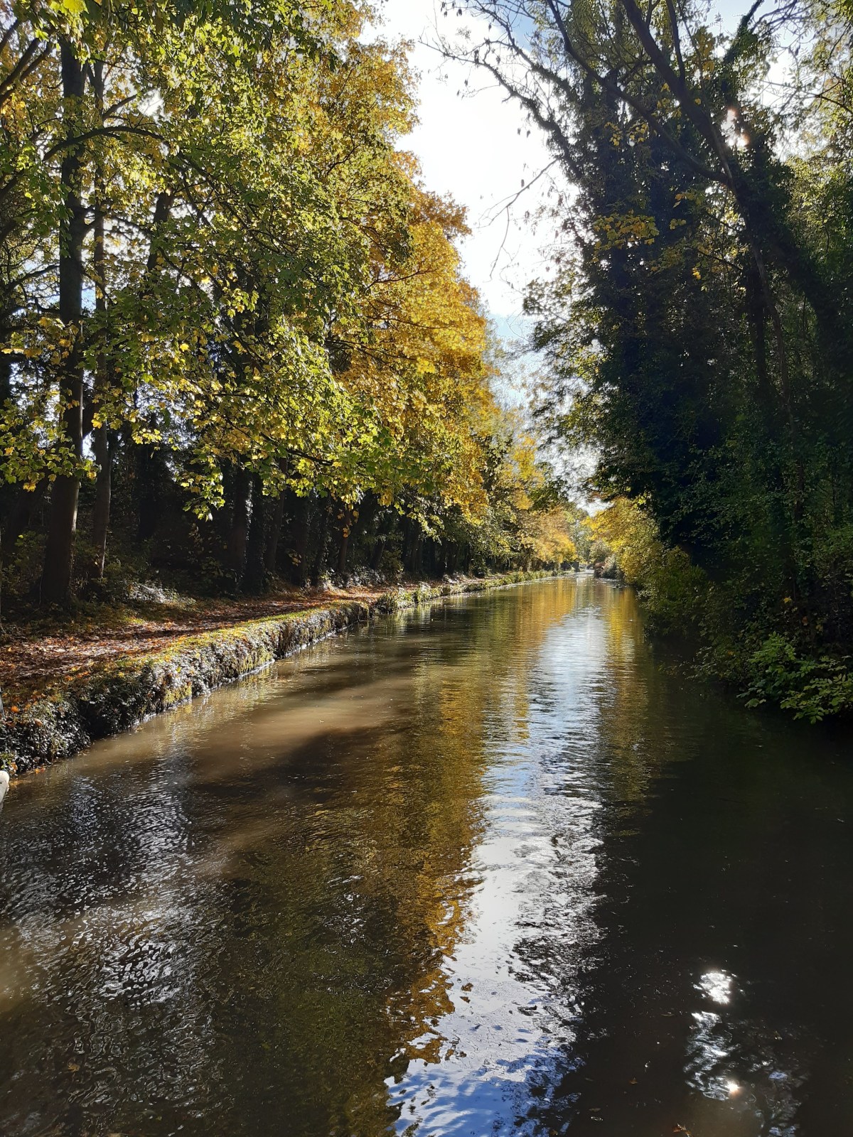 Setting off late morning, we meandered along the GUC past a place with the delightful name of Bugbrooke and enjoying beautiful autumnal scenery. Our final destination of the day, with no locks to hinder our progress, was the Blisworth tunnel. Not aptly named as there was nothing blissful about it! It is the third longest presently navigable tunnel in Britain so we knew that it would take about an hour to pass through. Going into the dark, dank tunnel, seeing nothing ahead save for the shadows cast by the one headlight on the boat. And then realising that a light far in the distance is actually a boat coming the other way so we are going to have to keep to our side of the tunnel to avoid a collision. In so doing, R managed to knock our chimney over (rookie error – we should have lain it flat before we started the day!) and fearing it would plop into the canal he suggested that I crawl along the top of the boat, in the pitch black, avoiding the photo-voltaic cells (PV’s) and reclaim it before the canal did. Not sure if I thought this a particularly good idea, especially as you are supposed to keep as much of you as possible in the boat whilst going through a tunnel! However, ever the dutiful wife I did as I was told and was mighty relieved when said chimney was safely stored and I was back in the boat rather than on top! Apart from the odd soaking when we passed under the airvents the remainder of the journey proved uneventful although R was pretty peeved off to be hassled from behind by a boat that seemed in more of a hurry than us and kept firmly to our tail. We spied the chap later in the pub at 1730hrs so we think he was just thirsty! The Boat Inn was another delightful watering hole which we visited before suppper aboard, having walked around the charming village of Stoke Bruerne at sunset. SB is popular with boaters because it is the home of the canal museum and normally well frequented as such. However Covid has meant the museum is currently closed and visitors are minimalised. It was our duty then to make sure we gave the pub some assistance!