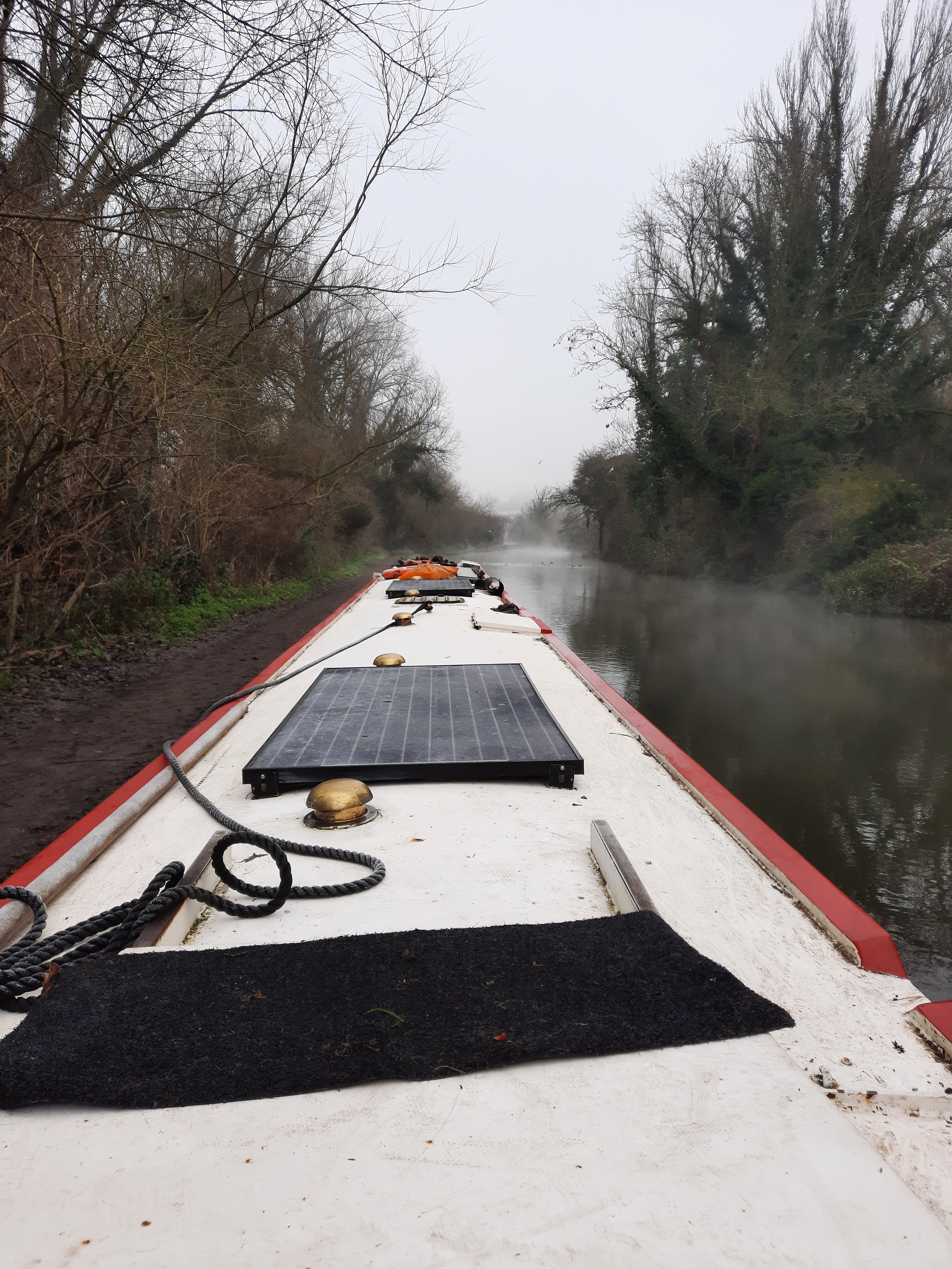 We are beginning to see the challenges of winter cruising, one of them being the copious condensation buildup inside. Luckily we have a choice of beds because the mattress in the bedroom is damp all along the side touching the cabin wall. We need to pull it away from the wall but that in turn narrows the walkway. A roll of black sacks has come in very useful acting as a barrier but I don’t think it will solve the problem!