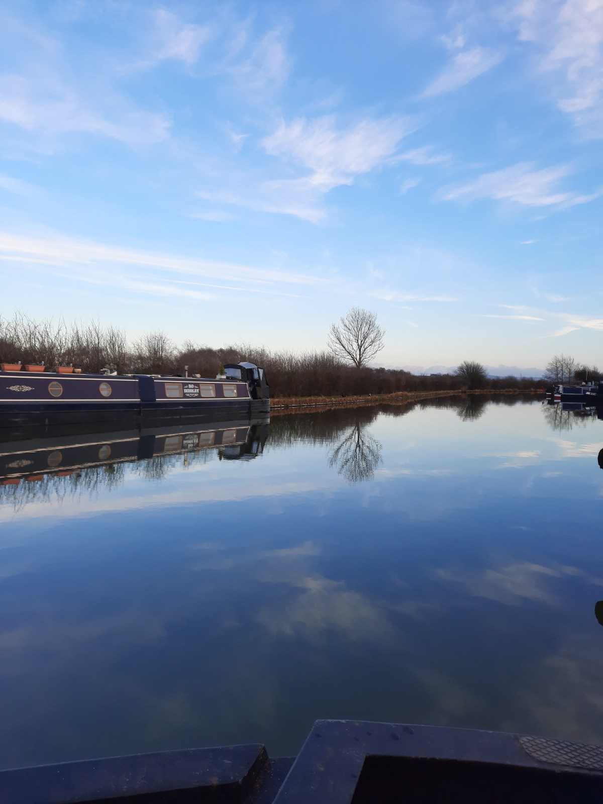 The afternoon cheered me greatly as I sat outside on the bow of the boat playing Trickster Bridge with the 3 girlfriends I have played bridge with for over 20 years although we haven’t been able to play online for a while for various reasons. My bridge, it turns out, was really rusty, with a few basic errors that annoyed me greatly. It’s such a good game for keeping the brain active so I don’t want to let it slip as my brain needs all the help it can get! Codewords are my other passion for brain games and a surefire way to help me fall asleep. Probably a better option than my current nightly pattern of watching an episode of the detective ‘Vera’. I have even started dreaming about murder! You may wonder why on a cold winter’s day I chose to sit outside on the boat. It was because it had turned into the most beautiful afternoon with a good smattering of blue sky and a little sun. I wrapped myself in many rugs and thanked God for the beauty around me. There is something so peaceful in watching reflections on still water.