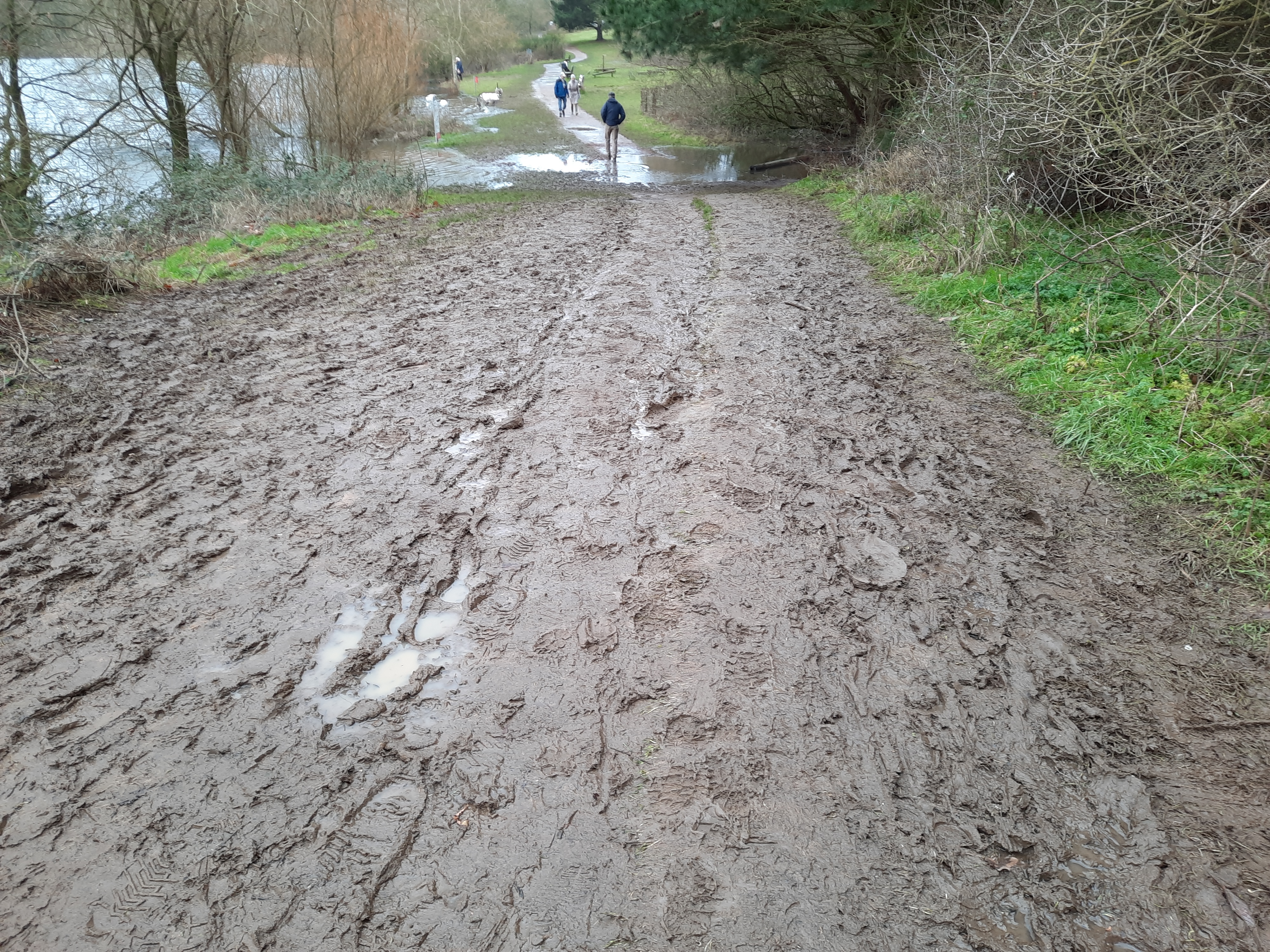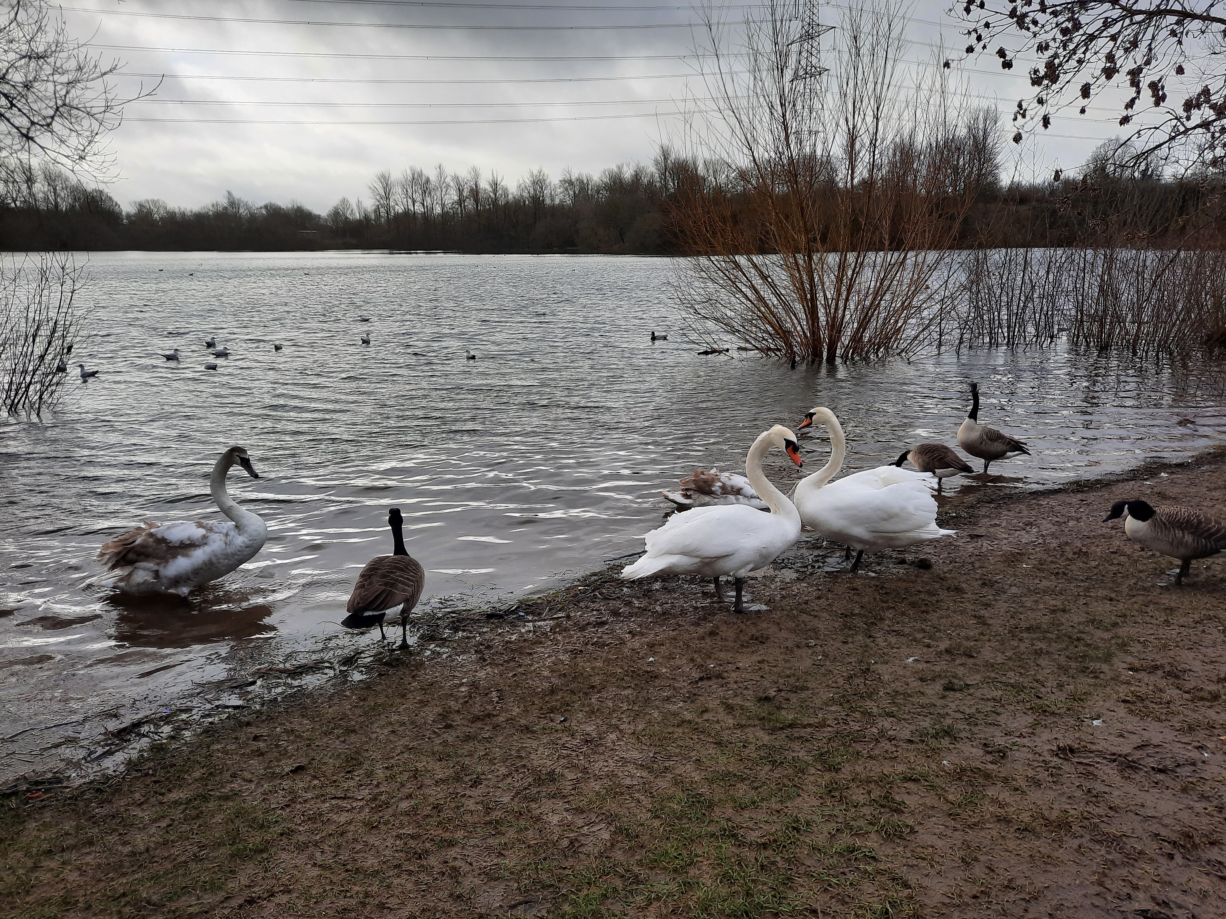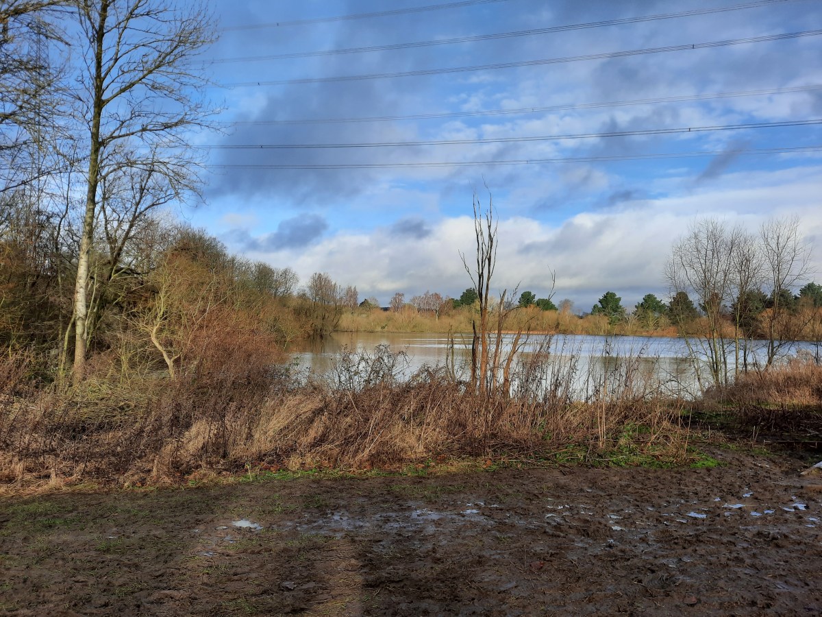 Walking out from the boat we discovered a lovely park on the opposite side of the canal, reachable now the flooding is reduced and we can walk across the nearest bridge. The paths were still a mudbath but my tactic of lining my wellies with plastic bags is working well and even though I waded through a few puddles, my feet remained reasonably dry! Occasionally the sun came out which reflected beautifully on the sizeable lakep and there were lots of ducks and swans meandering around. Plenty of toddlers enjoying the puddles and people taking their daily exercise.