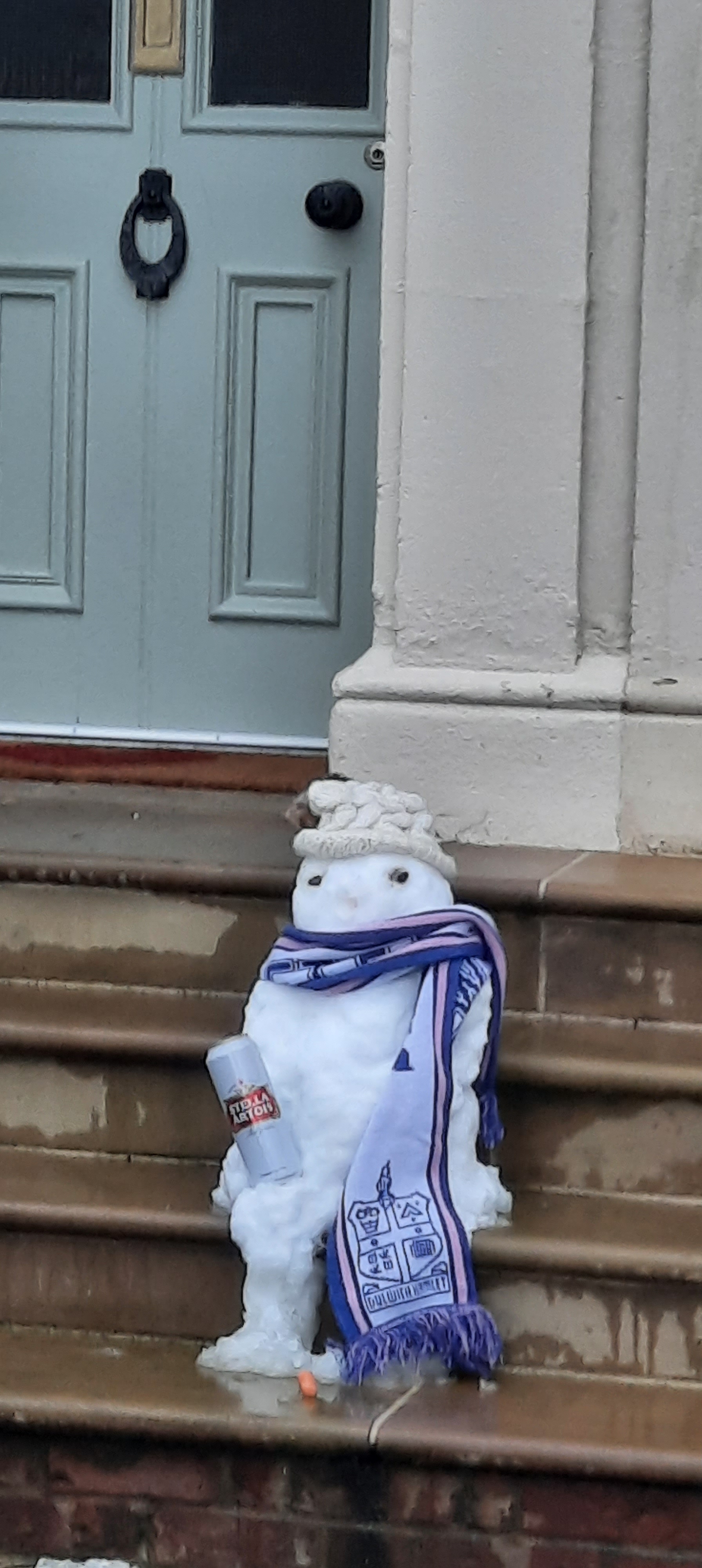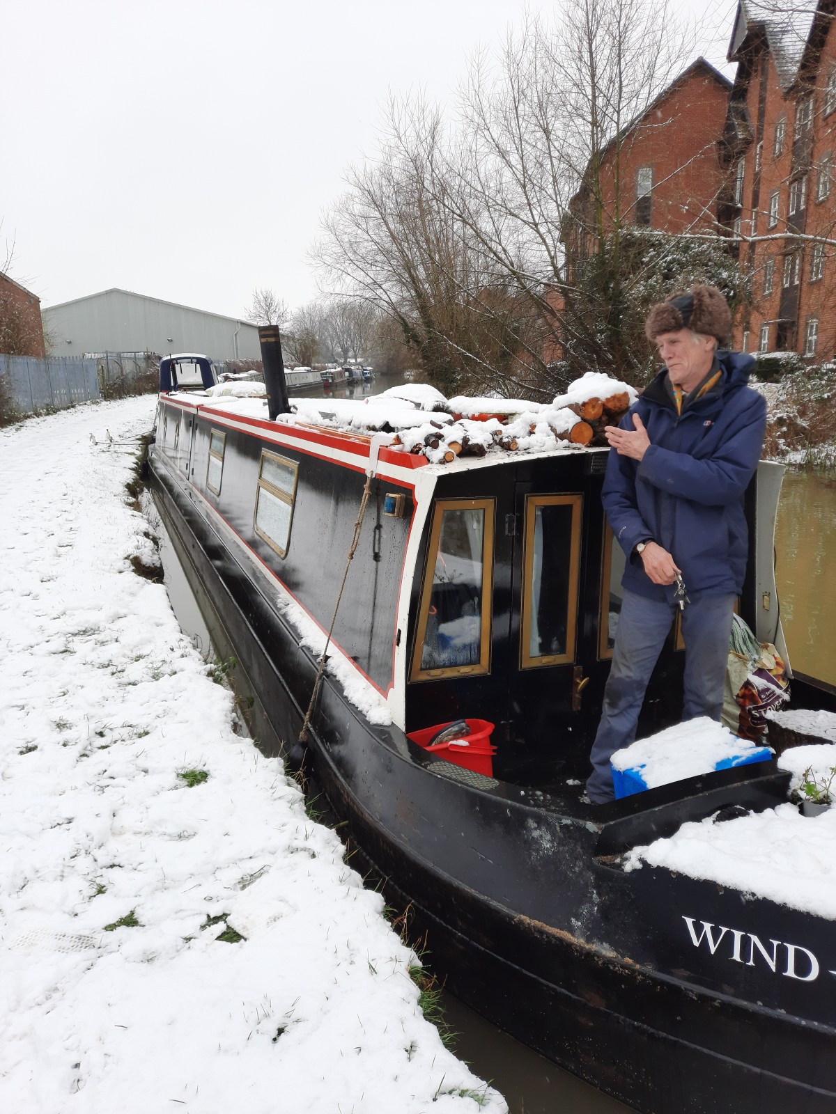 The snow had stopped falling by the time we had enough layers on to venture outside and LB looked rather magical shrouded in white. We trod carefully, not wanting to slip on any icy patches, and had not ventured far before a Chinese lady pushing a pram, indicated that she had found a mobile phone on the ground. Speaking very little English, she was keen to give the phone to us to sort the problem of how to find its owner. The phone was locked but the screenshot was of a school timetable with a girl’s name so I thought if all else failed I could ring round the local schools tomorrow. R thought there might be somewhere to leave phone at fire/police station so he wandered off to speak to them whilst I waited with phone to see if the owner came looking for it. To keep warm I did my Joe Wicks routine which must have looked a bit strange but no one commented! Eventually R returned having had no luck speaking to anyone so we continued on our walk hoping the phone might ring. We found a large park we had never walked through before and there was an amazing snowman with a snow dog! Returning eventually back to the boat I noticed a missed call on the phone by an ’emergency’ contact. Although the phone was locked it allowed me to ring this number and thus reunite the phone with its very grateful young owner whose emergency contact was her father. Relief all round.