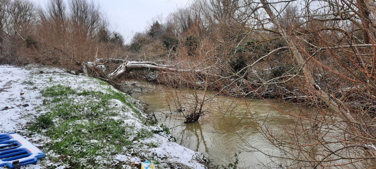 R has other ideas! He’s decided this is as good a day as any to sweep the chimney. This involves him on the inside of the boat fiddling around with the flue and me on the outside pushing a stiff brush up and down the chimney to dislodge the soot. Infact it didn’t take long and the snow was only a gentle flurry. So, as we were suitably warmly dressed we went for a walk heading into Fenny Stratford. Taking a left we found ourselves at a Dobbies garden centre which advertised that it had not only ‘Cook’ but Sainsbury’s as well in store. It was definitely warmer than both the boat and outside so we decided on a bit of retail therapy, in the hopes they might sell wellies, among other things. We were not disappointed, so not only did R buy a short pair but I replaced my leaking ones with a fushia pink long pair. I can’t wait now to try them out in the flooded area going towards the nearby lakes. Looking at the forecast there’s a window of sun tomorrow morning before more snow arrives in the afternoon, so we shall be up and out early!