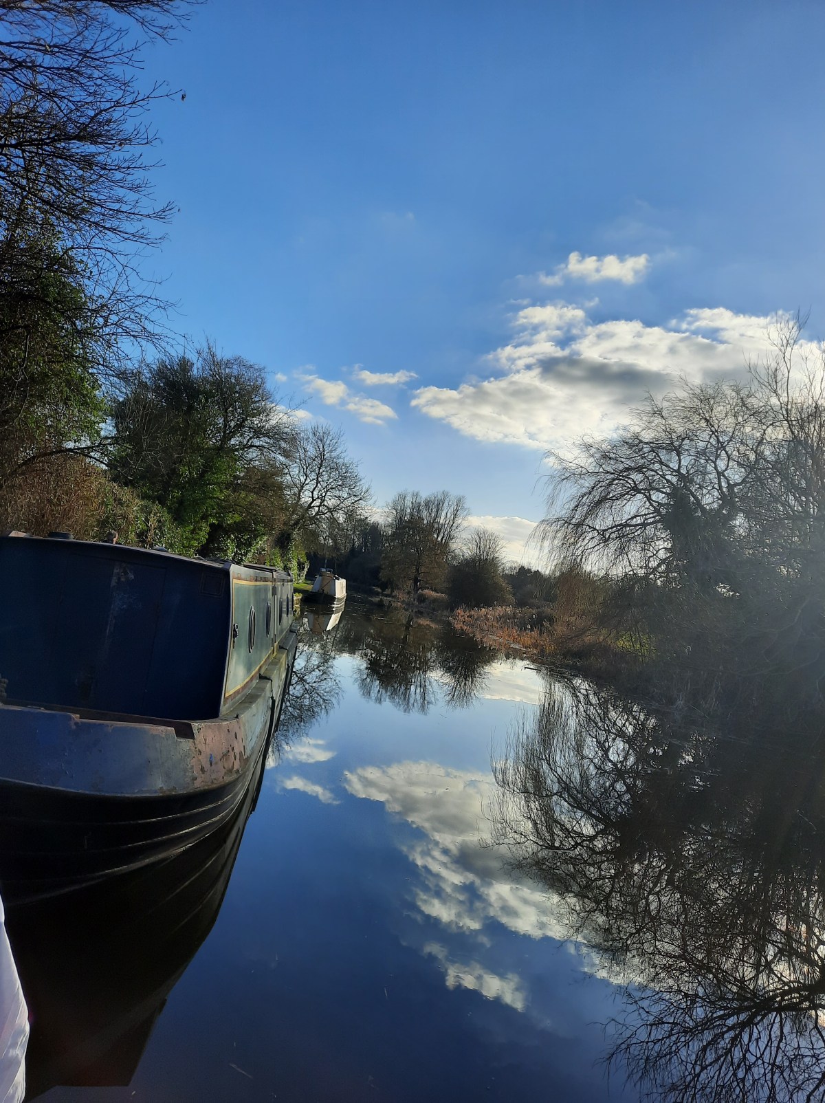 It was such a lovely evening that we took our foldable chairs onto the towpath and found a sunny spot to enjoy a glass of wine as the sun went down. I am always amazed by the beauty of the reflection on the still water when a mirror image appears of the boats and trees.