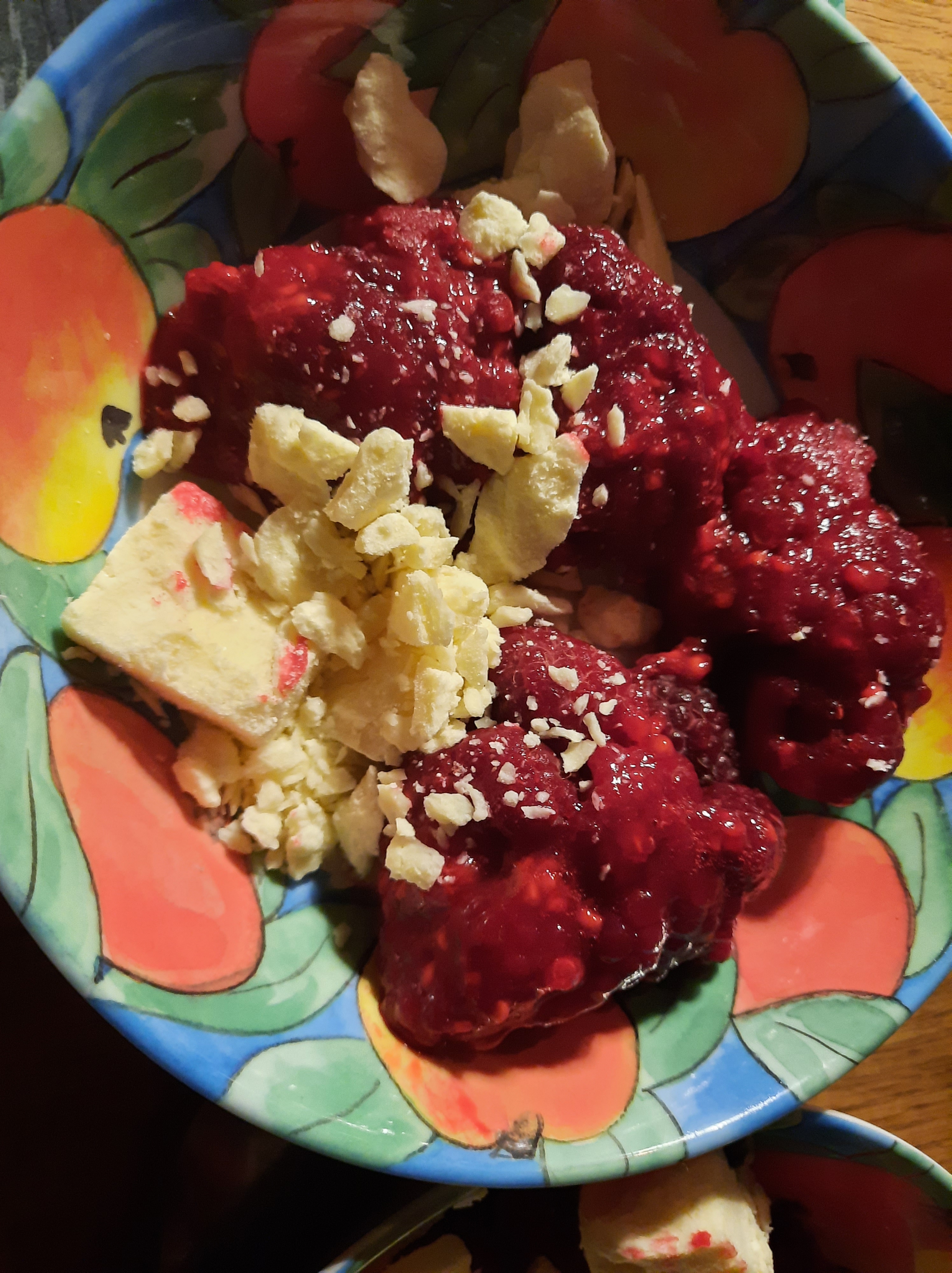 I decided to make an effort for our dinner as it’s our anniversary weekend so actually bought some lamb steaks and managed to cook them without turning them into old leather! The dessert was a bit of a surprise. Having thought there was a portion of gin and tonic parfait left in the freezer I instructed R where to find it and suggested he added it to some raspberries. He showed me what I thought was parfait before dividing it between our two bowls of fruit. We were both rather surprised to find that actually there was no parfait left in the freezer and what we were about to eat was frozen crumbled cheddar cheese!!