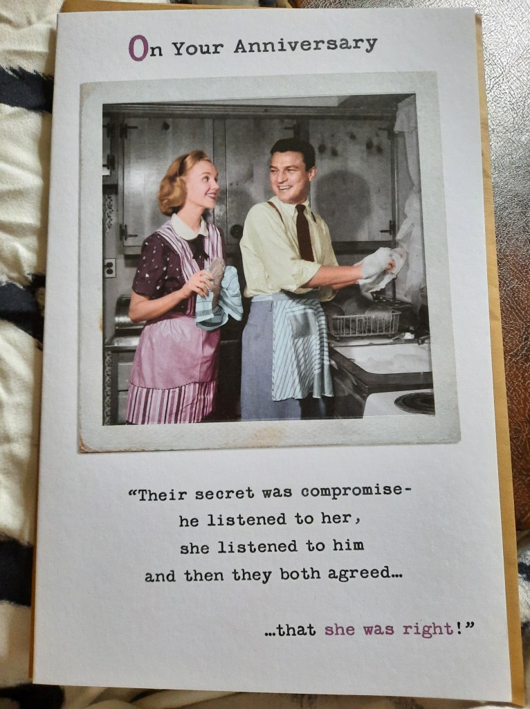 Started the day with a very apt anniversary card from R which explains why our marriage has worked so well!