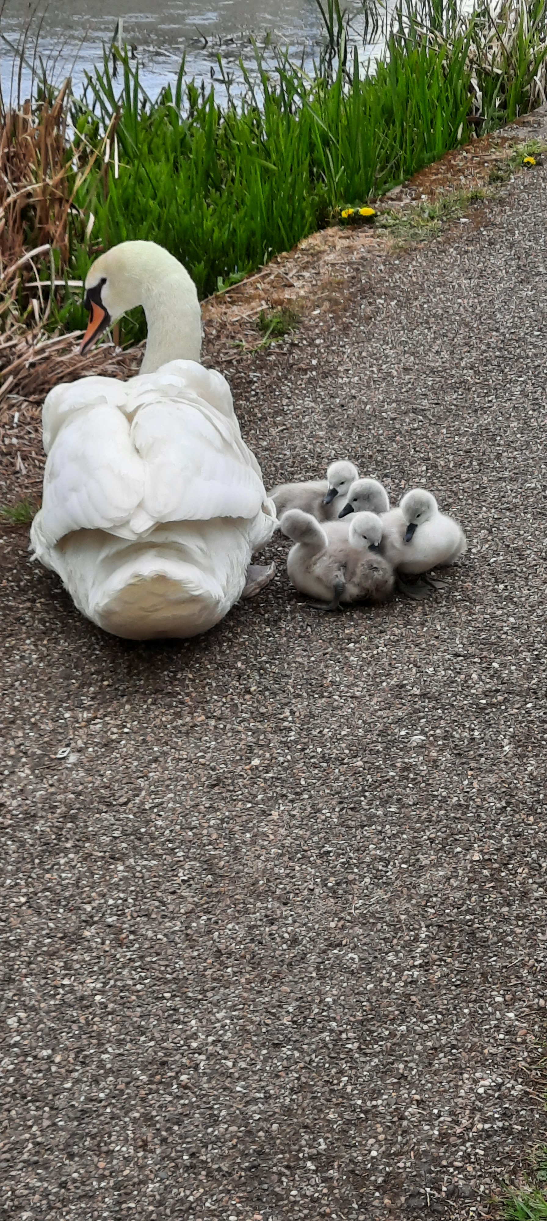 There were a few heavy showers to contend with but the highlight of the trip was rounding a bend and there on the towpath was a swan with her newly hatched cygnets. It was a magical moment and so unexpected amidst the builtup area that we were in. R held the boat to the side of the canal whilst I gingerly made my way back along the footpath to take some photos and a video to capture the moment. Back on the boat R was in conversation with a man who wanted to walk past the swan on the towpath but was nervous that she would take fright and launch at him. Swans have enough power in their wings to break an arm I have been told.
