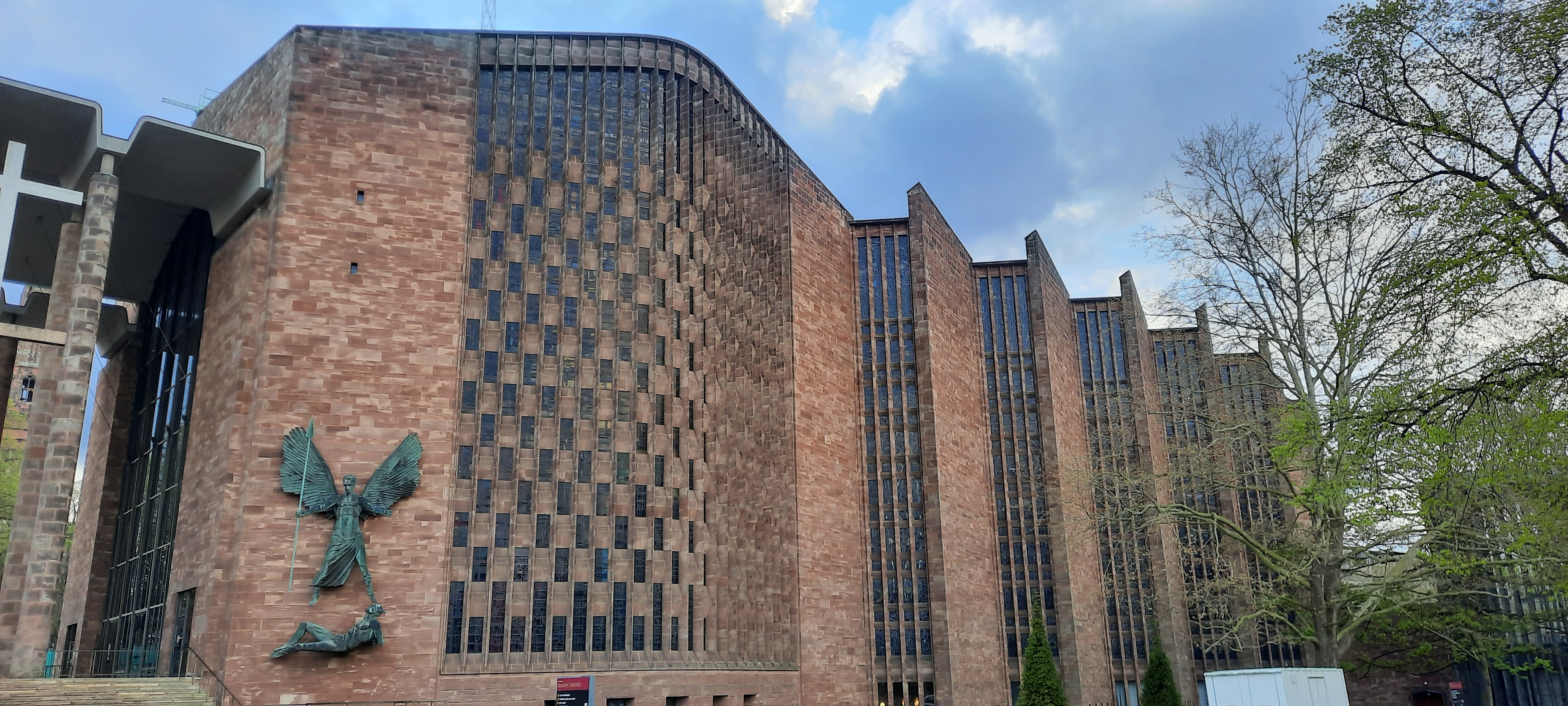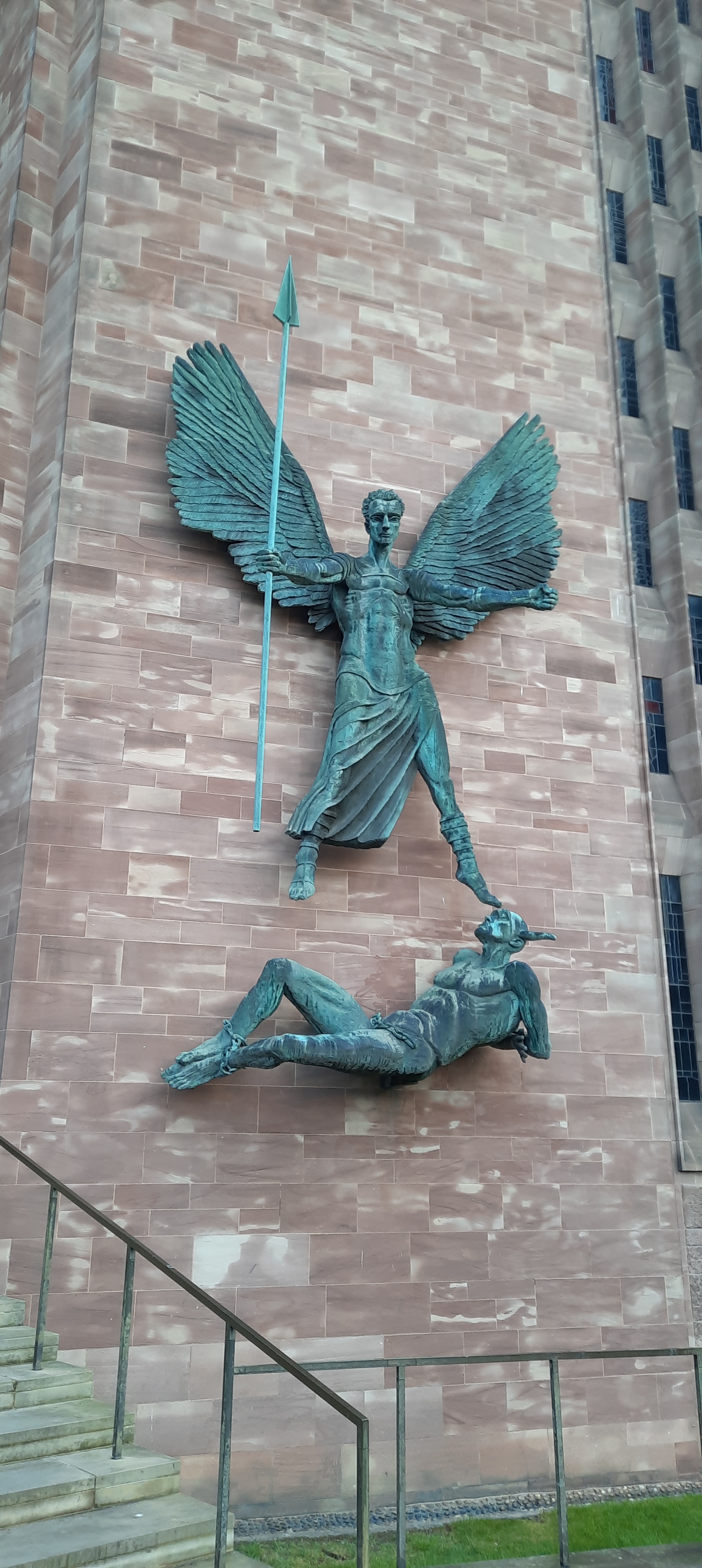 The weather was cold, wet and white, not enticing at all to make us want to leave the boat in any immediate hurry. Looking at the weather forecast, tomorrow is set to be a far sunnier day. So I made soup to warm us and then we settled down to do nothing much until patches of blue were seen in the sky and the sun occasionally peeped through the clouds. It was late afternoon when we left the boat to find R’s flat and then wander into the city centre to see the sights. The most magnificent by far being the two cathedrals, side by side. The old and the new, the bombed out and the beautiful. Yes, modern and maybe not to everyone’s taste and yet the beauty of the stained glass windows and the rebirth out of destruction. Sadly we could not go inside as the cathedral had closed for the day and the old part is surrounded by metal fences to keep everyone out. There is something very sobering about having such a reminder of WWII staring you in the face.