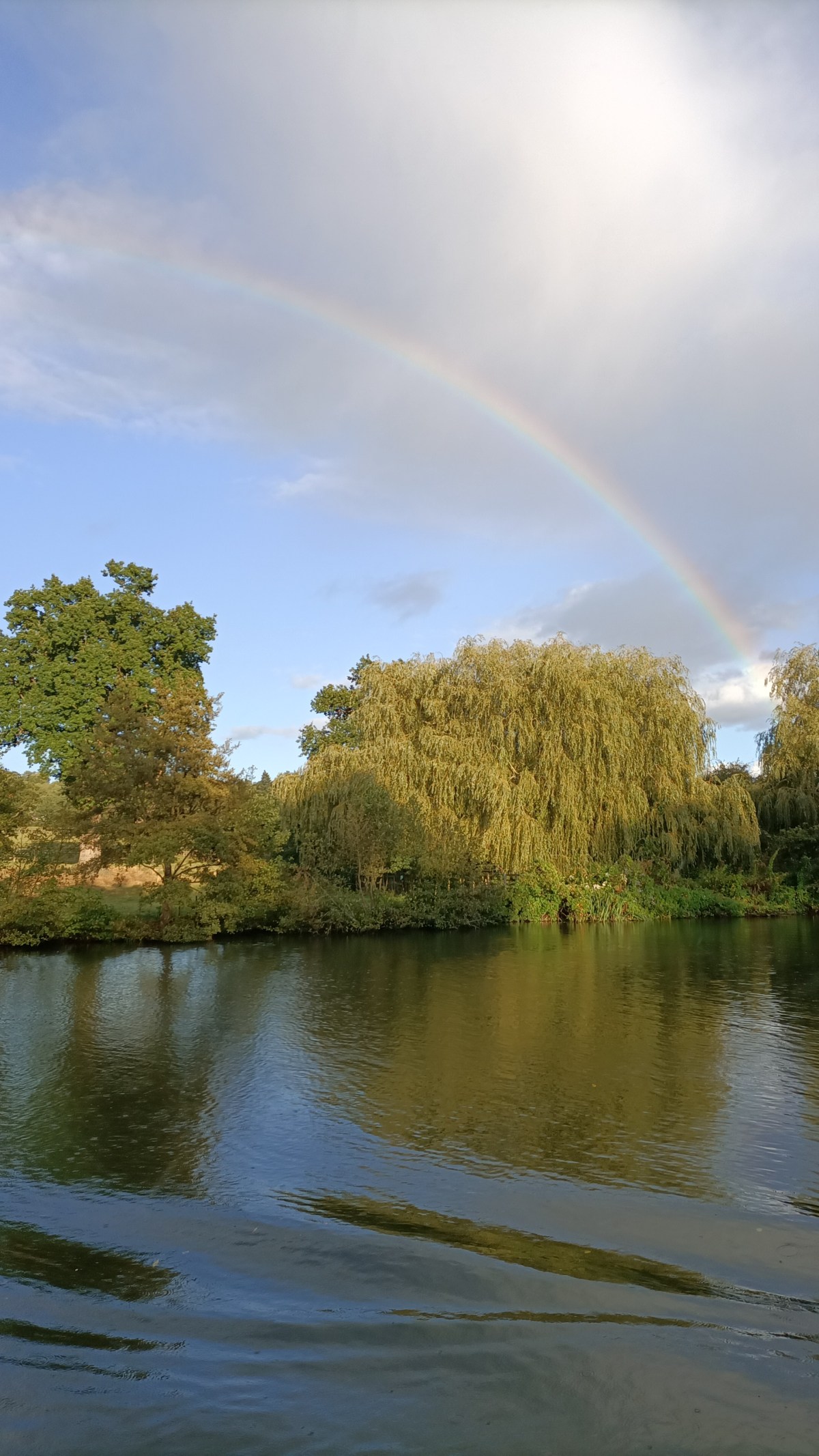 Monday morning saw us hit the Thames early, before even the lock keeper arrived to operate the motorised pushbutton lock gates. Luckily R figured out what to do but it was a bit unnerving. The rain was lashing down and everything looked a bit scary and big! The water on the river flows much faster than on the canal and the river is a lot wider in most places. However eventually the rain stopped, the sun came out and we made very good progress. It was beautiful and serene with hardly any other traffic on the river. Our only concern was that the lack of lock keepers on the first three locks meant we had been unable to obtain a licence to travel along the Thames and we could incur a £1000 fine. Trying to get the licence over the telephone proved futile because we had no paperwork on the boat – unhelpfully when the other crew left the boat they took it with them for safe keeping! Thankfully at lock number four we met a delightful lock keeper who not only issued a licence but also told us of the best places to moor on our way into Reading – apparently once you get into Reading proper there are a lot of undesirable places to stop so it was strongly suggested that we didn’t! Suffice to say, by starting our journey every day at 8am and traveling without stopping for 8/9 hours we managed to get the boat to its final destination by Tuesday lunchtime, with a great sense of achievement. Only one or two mishaps – seeing a rowing four out on the river, I thought a picture would be fun to send to our daughter who used to be part of a rowing four. By the time I got my phone out to take the picture I had managed to head the boat in the direction of the river bank and R had quite a job to stop us getting stuck in the muddy bank, overhung with weeping willows! Then, when we were mooring up R misjudged the slope of the bank and slipped, falling quite heavily on his thigh which has left him with rather a painful bruise. There was also a challenging lock on the Kennet & Avon canal. The flow of water into the incredibly deep chamber was extremely forceful and it was only as I was attending to the lock gates I saw a sign saying that we were contending with river current and should not proceed when the current was strong. A reminder that the weather can definitely interfere with ones progress! It was a relief to arrive at The Cunning Man pub, our final destination and to enjoy one of their squash and mushroom rolls – their veggie take on a sausage roll! Coincidentally we had visited this pub two weeks earlier when viewing a secondhand narrowboat for sale, little realising we would be back so soon. The food was just as tasty as we remembered!