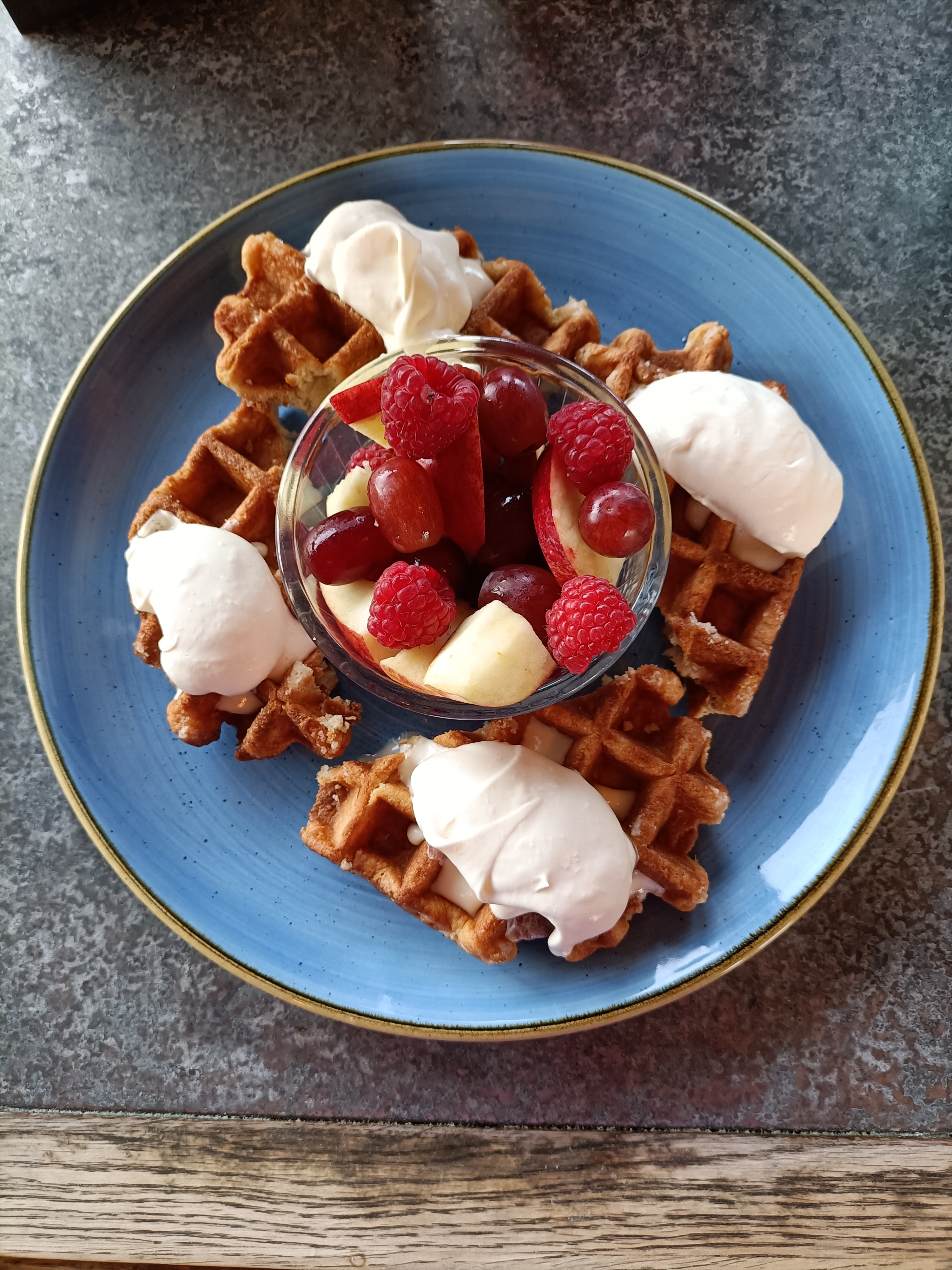 I am not a fan of taking pictures of food but decided I needed to be reminded of my very indulgent breakfast today. First surprise was that the teapot actually contained very strong coffee (ordered by R, thinking I would prefer it to tea) and then we were handed a menu, all things egg. Decided waffles, fruit and yoghurt was manageable only to be told the dairy delivery had not arrived so no yoghurt available – would I prefer ice-cream? Even I think ice cream for breakfast is maybe a little too much so compromised on a little double cream!