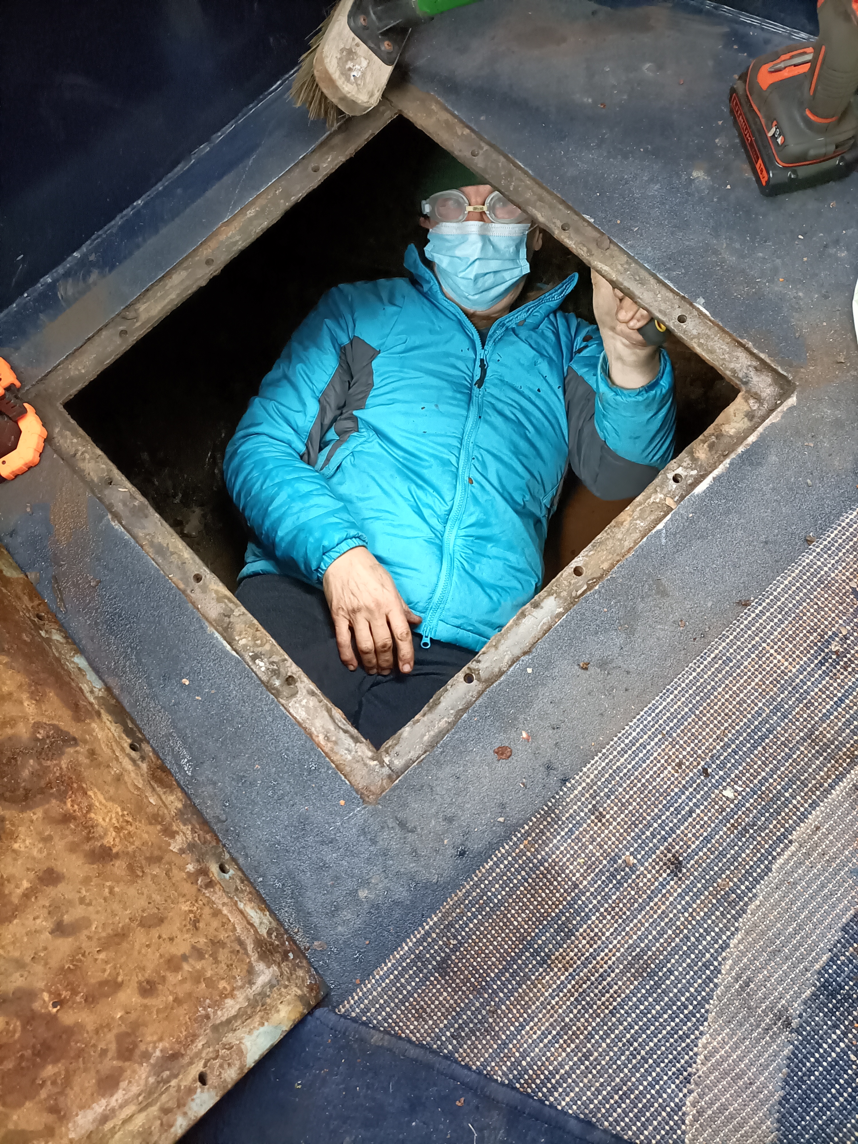 I’m not sure Monday was my most romantic of valentine’s days – a lot of it was spent in a small hole, 2ft by 5ft and 3ft deep – namely our boat water tank! Anyone who has ever done this job says it is a once in a lifetime experience. I had been pre-warned by watching a You tube video on ‘how to derust your steel watertank’ and even though in my book it is a definite ‘blue job’ (apologies for being sexist) in reality there are few men who can fit inside a small sized watertank, especially R at 6ft 3″! For those who are not familiar with this subject, on purchasing Naomhòg I was a little perturbed to read that ‘boats with integral steel water tanks should be painted on the inside every 4 or so years to prevent the build-up of rust’. On asking the previous owners if they had ever done this they said ‘no’, which came as a slight surprise as they have been meticulous about most of the boat maintenance. Perhaps, because they didn’t drink from it, they didn’t feel it was an issue. I meanwhile, with my vivid imagination, had visions of a rusty tank that would eventually rot and leak and we’d sink! So with the tank still dry from being emptied as a protection against freezing I suggested to R now was as good a time as any to look inside. Much easier said than done. The screws had been painted over and even after we managed to remove them the 1m square lid was firmly stuck. It required a hammer and crowbar and the extra muscle of our eldest son G, who happened to be passing en route with his fiancée to Scotland last Saturday. We did reward them with lunch, after a blowy and muddy walk to the local pub – we had hoped to take them on Naomhòg, but R decided the wind was to strong and we might have difficulty returning to our mooring (we are learning that you can’t be too prescriptive about how you spend your day on the boat – all sorts of obstacles get thrown at you).