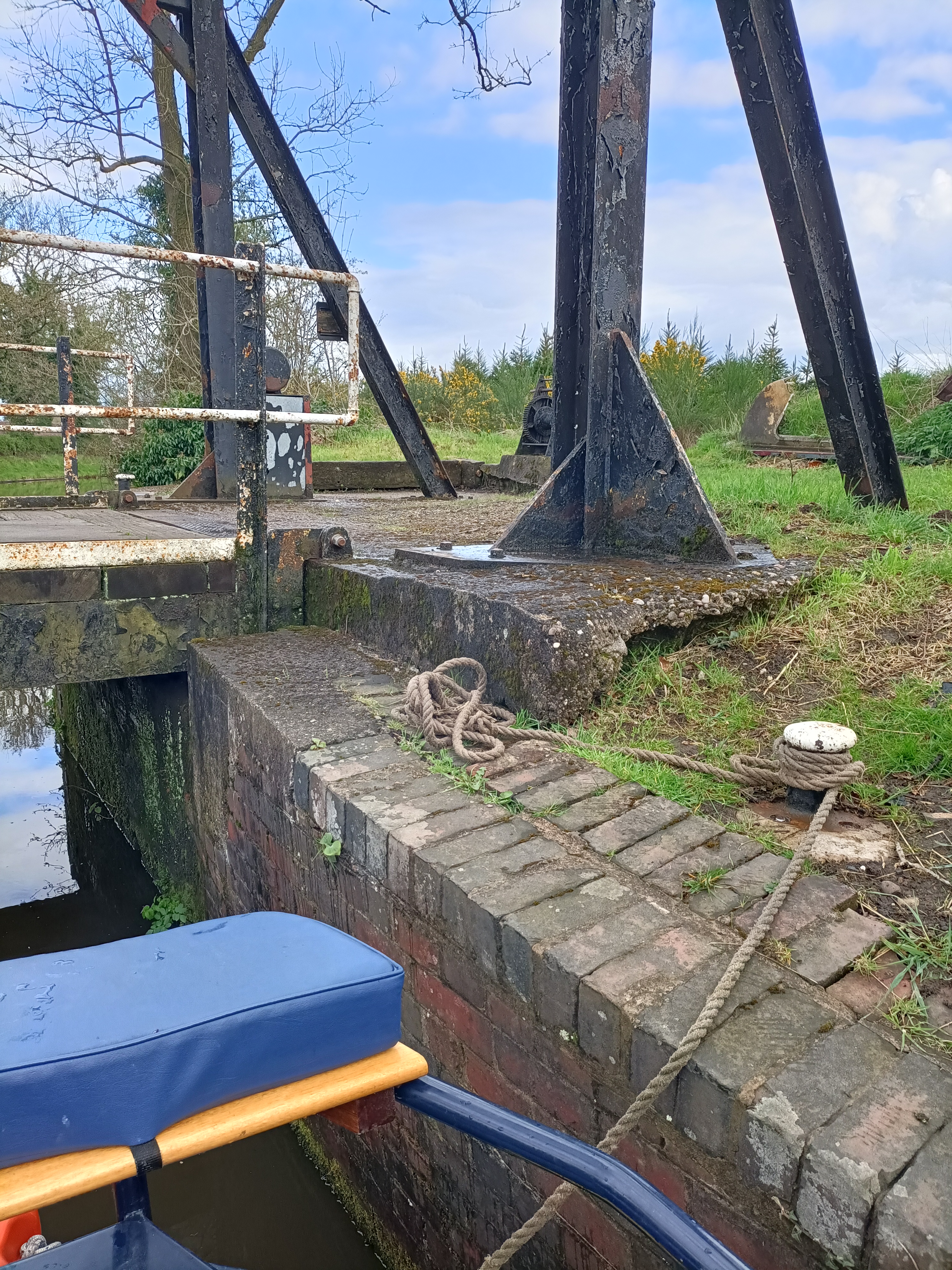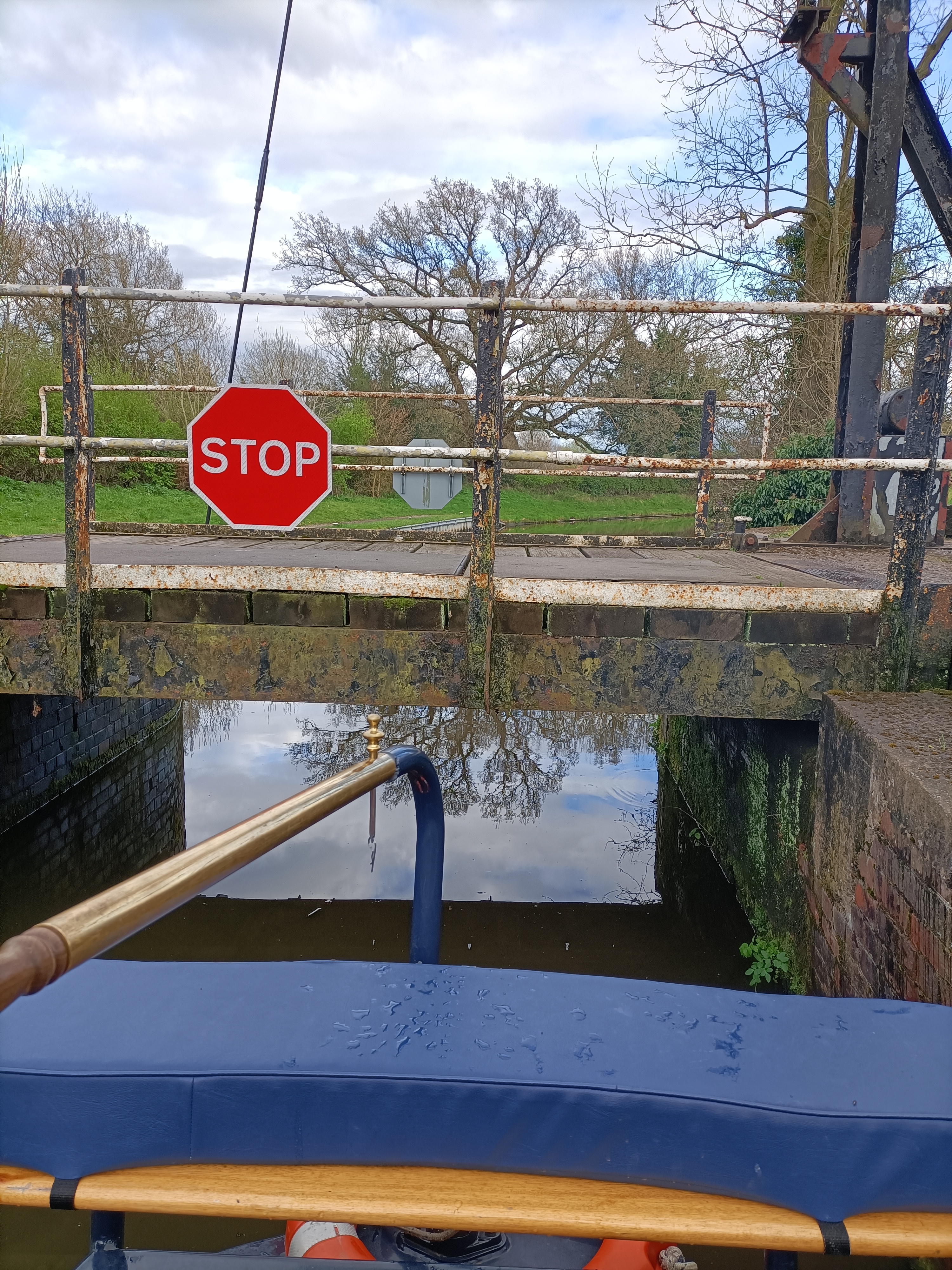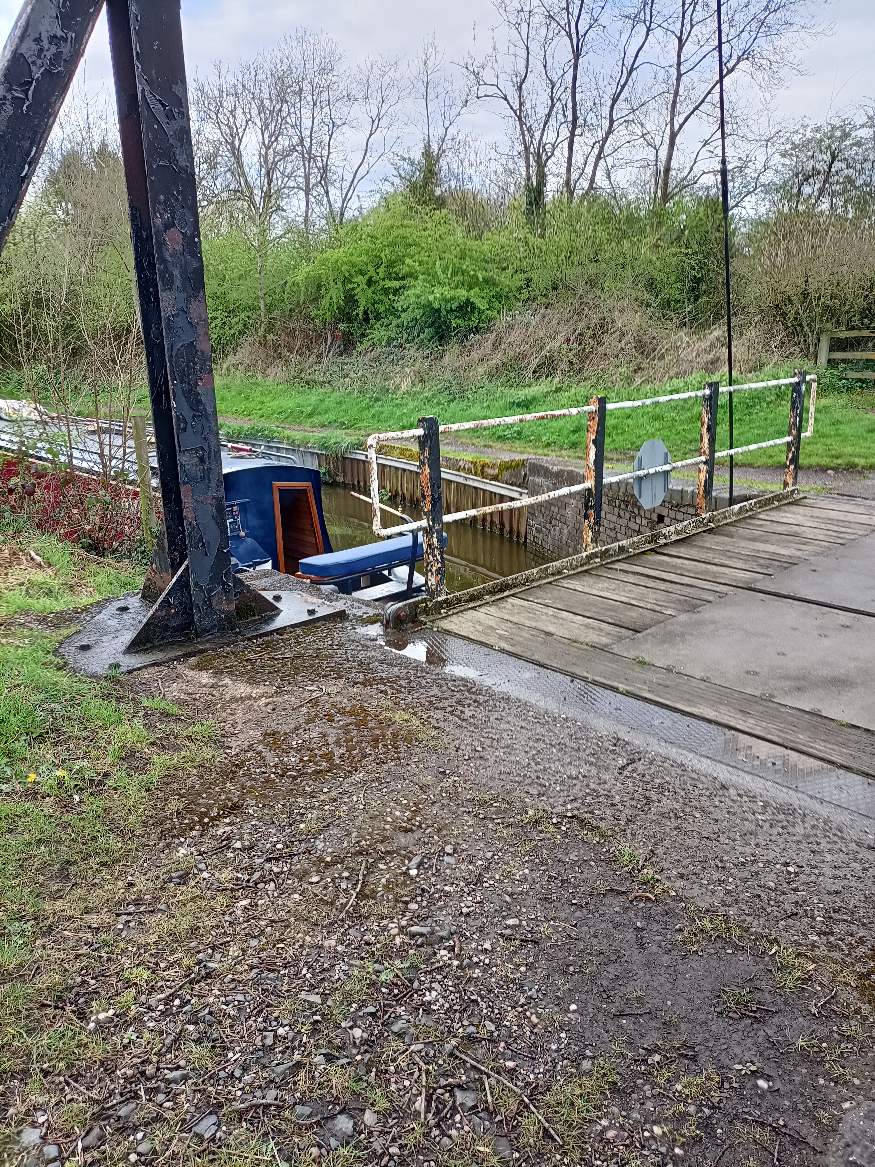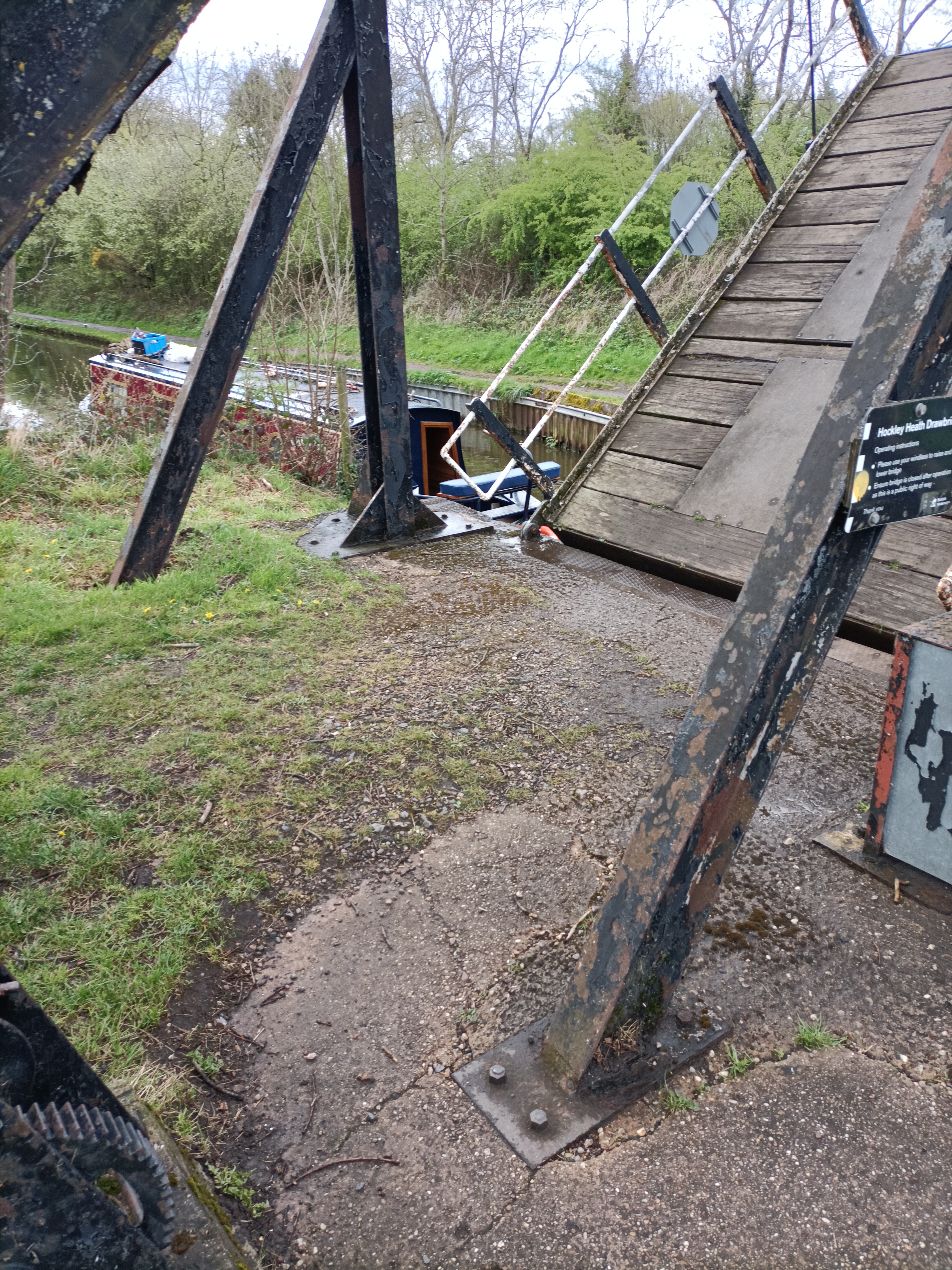 We’d passed through quite a lot of rain on our car journey and judging by the wood on the roof there had been some rain here but the skies cleared up and so we decided to move further along the cut, mooring up outside a pub for the night, where R could also park the car. He left me to take the boat along the canal and the only tricky part was the drawbridge I had to operate alone, using my windlass to wind it up and down. What a doddle, or so I thought as I confidentially moored the boat at the preceding bollards on the right hand side. I crossed the bridge and started to raise it and then suddenly wondered how I was going to get back to the boat myself!! Obviously the bridge was by now up and there was no other means of crossing the water. What followed was slightly precarious. I returned to the boat and manoeuvred it to the left bank, walked along the outside of the boat, secured the bow rope on the one available bollard and then realised my windlass was at the stern end. Back along the outside, retrieved windlass and then on return to the bow I had to scramble off the boat onto the bank. The bridge opened easily enough so I then returned to the stern, moved the boat under the bridge and then tied the stern rope to the bollard just on the other side of the bridge. Once again jumped onto the bank, lowered the bridge, by which time a dog walker was waiting patiently to get across and was amazed I was doing this single handedly! Back on the boat and off I went feeling rather pleased with myself that I hadn’t fallen in the water, nor had my mobile phone. I wanted to record the event but it is really too risky to accomplish that manoeuvre with a phone at hand!