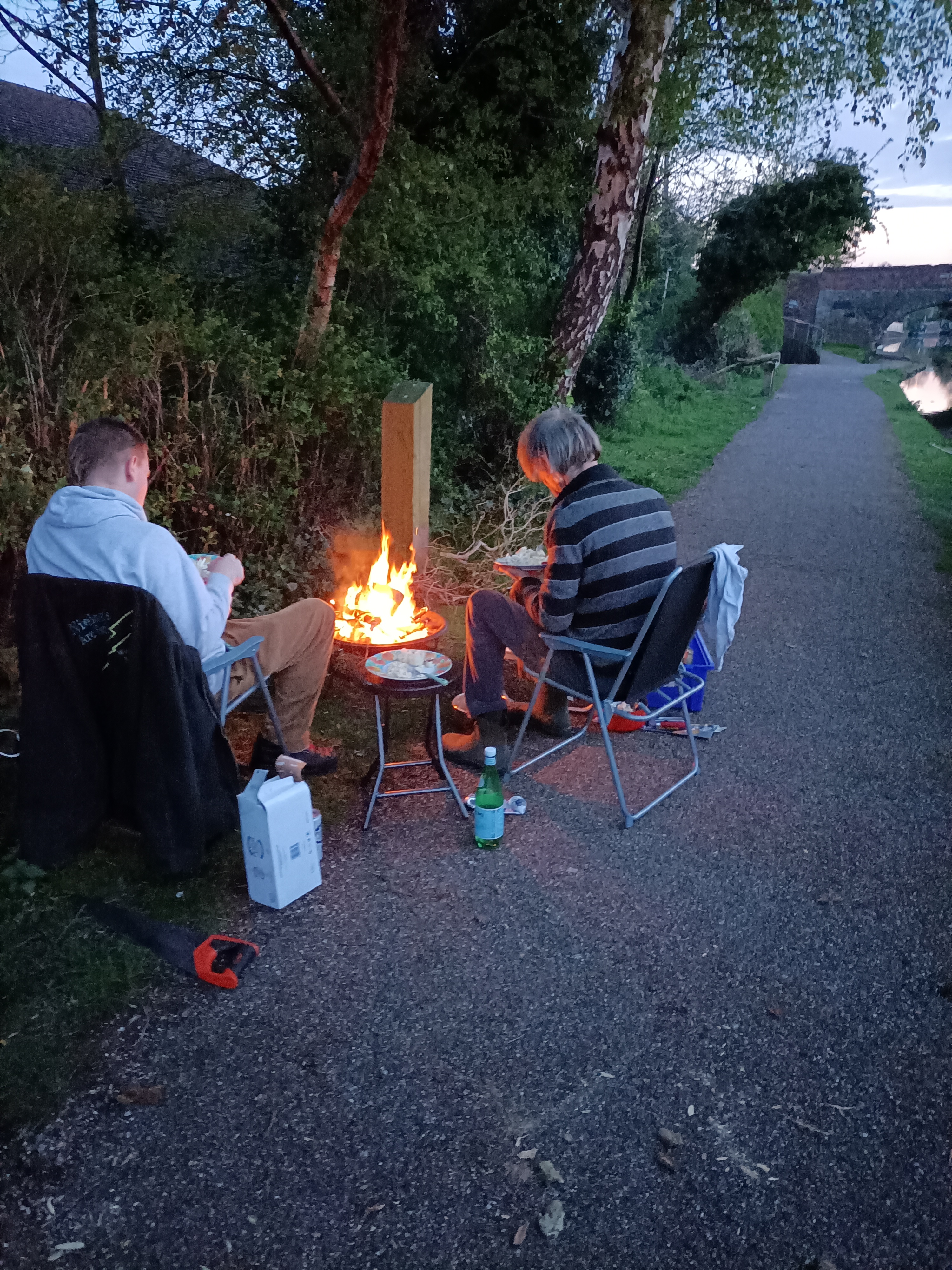Our excitement for the day was welcoming son P onto the boat. I think he was slightly surprised at how small Naomhog is but he soon made himself at home and tried to get used to entering the door sideways. He certainly couldn’t enter with his rucksack still on his back. He and I walked to the nearest food shop which happened to be next to the railway station about a mile away. He’d only just come from there but he didn’t seem too bothered and at least the sun was shining. It enabled him to choose the food he wanted to eat and get a few beers, although as he was still drying out from the effects of his brother’s stag weekend, the beer count really was moderately low! He did want to make smores though, on the firepit R had prepared in our absence, the towpath being conveniently wide. To the unitiated, a smore consists of a digestive biscuit, chunks of milk chocolate and marshmallows, all of which you heat up on the fire. A mass of delicious gooeyness!