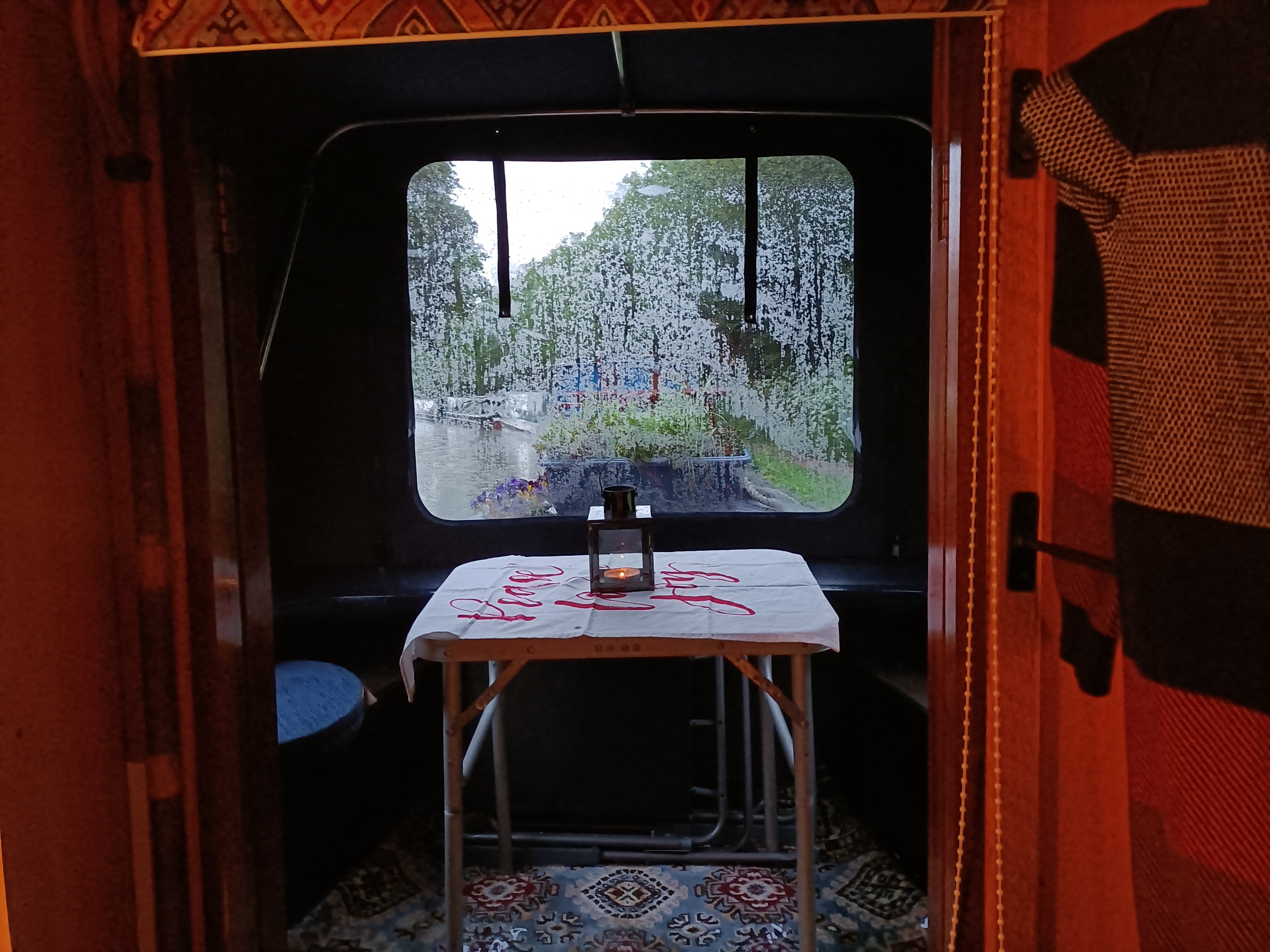 Today is the day the new cratch covers arrived for the boat and as I sit here now listening to the rain pitter pattering on the canvas I am delighted the bow cratch appears totally water tight! It’s like having a new extension, somewhere to eat breakfast (if I’m ever up in time!). Unfortunately the stern cover had a slight error, noticed not by us, but by the supplier, John of Jectec. He said he wasn’t satisfied with it so has taken it back to be altered. As he’s going on holiday for a fortnight tomorrow we will have to be patient and look forward to our stern cover on his return. Such is canal life! It also alters where we can go because we don’t want to be too far from Melton Mowbray, their home base.