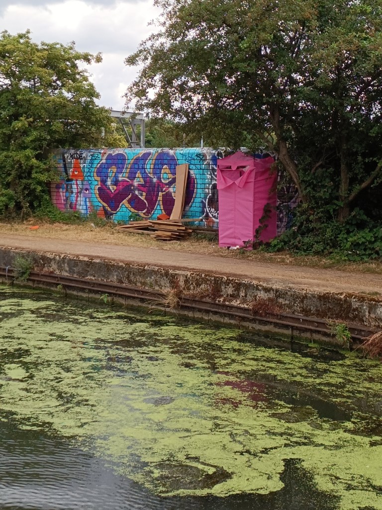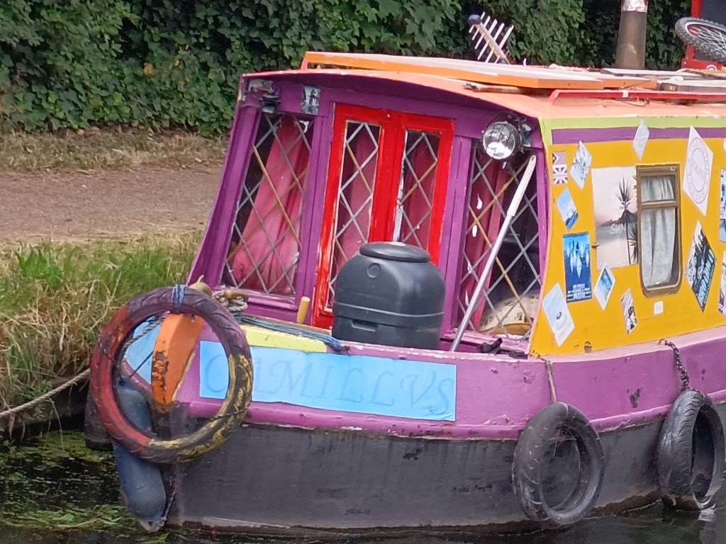 The members of the Hillingdon boat club were very welcoming and we enjoyed a fun club evening with them. Ji was particularly helpful, setting me up with electricity and showing me the ropes. When he realised the issue I had with my bent stern strut he offered to try straightening it in the workshop along with the bent coupling. Both he managed to do, thus saving me the necessity of returning the strut to Melton Mowbray for replacement and then having to collect it from there a few days later. A logistical nightmare without the car! Discovering Ji had a passion for milk chocolate with caramel I set off to find both a sweetie shop and a shop selling mattress toppers as Ho suggested the dinette bed would benefit from one. Four miles later, a couple of downpours and I was back at the boat with my purchases, so relieved to see the pram cover looking shipshape!