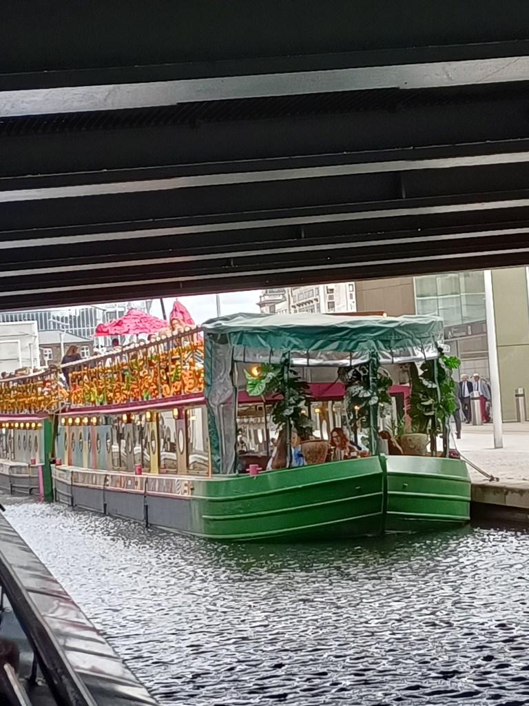 Arriving at Alperton, we were joined by my neice, over from Japan and her toddler, our youngest guest to date. I was thankful for the canvas barrier we now have in place encircling the stern, but even so we all had to keep a careful watch on Ka. We were drawing straws as to who would jump in after Ka, should he end up in the water. I said I was too old, his mum is expecting a baby, so it was Ho who was designated as lifesaver! Fortunately no such drama arose and we were all fascinated at seeing London from a canal perspective. There was a lot of wall art which cheered up many of the concrete expanses lining the canalside. Arriving in the basin itself I was cheered to see how attractive it was, thinking that it may have looked tired and run down. We are moored directly outside an M&S food store and there are numerous eateries, many of them afloat.