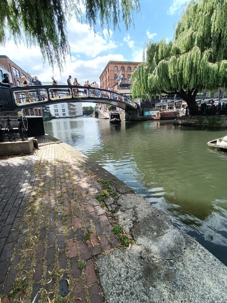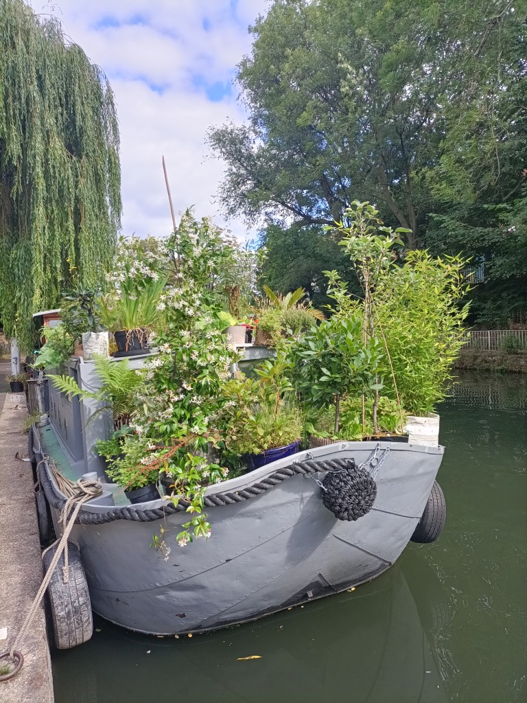 A decade ago R and I visited some english friends, living at the time near New York and a highlight of our trip was being taken on their speedboat to see the Statue of Liberty. It was one of those memories that never quite leaves you! Living now in London, we invited them to join us on Naomhòg as we journeyed yesterday from Paddington Basin to Colebrook Row in Islington. Not quite as speedy but equally interesting as we travelled through Little Venice, Regent’s Park, London Zoo, Camden Market, Kings Cross, on a sunny July day. How different London looks viewing it from the water and once again I was struck by the diversity of people who enjoy walking/cycling the towpath or living the boaters life, some in expensive, top of the range widebeams and some in boats that seem barely afloat. Such a kind community of people, mostly keen to look out for one another and offer helpful advice for visitors, such as us, just passing through and wanting to make the most of our stay at the Angel.