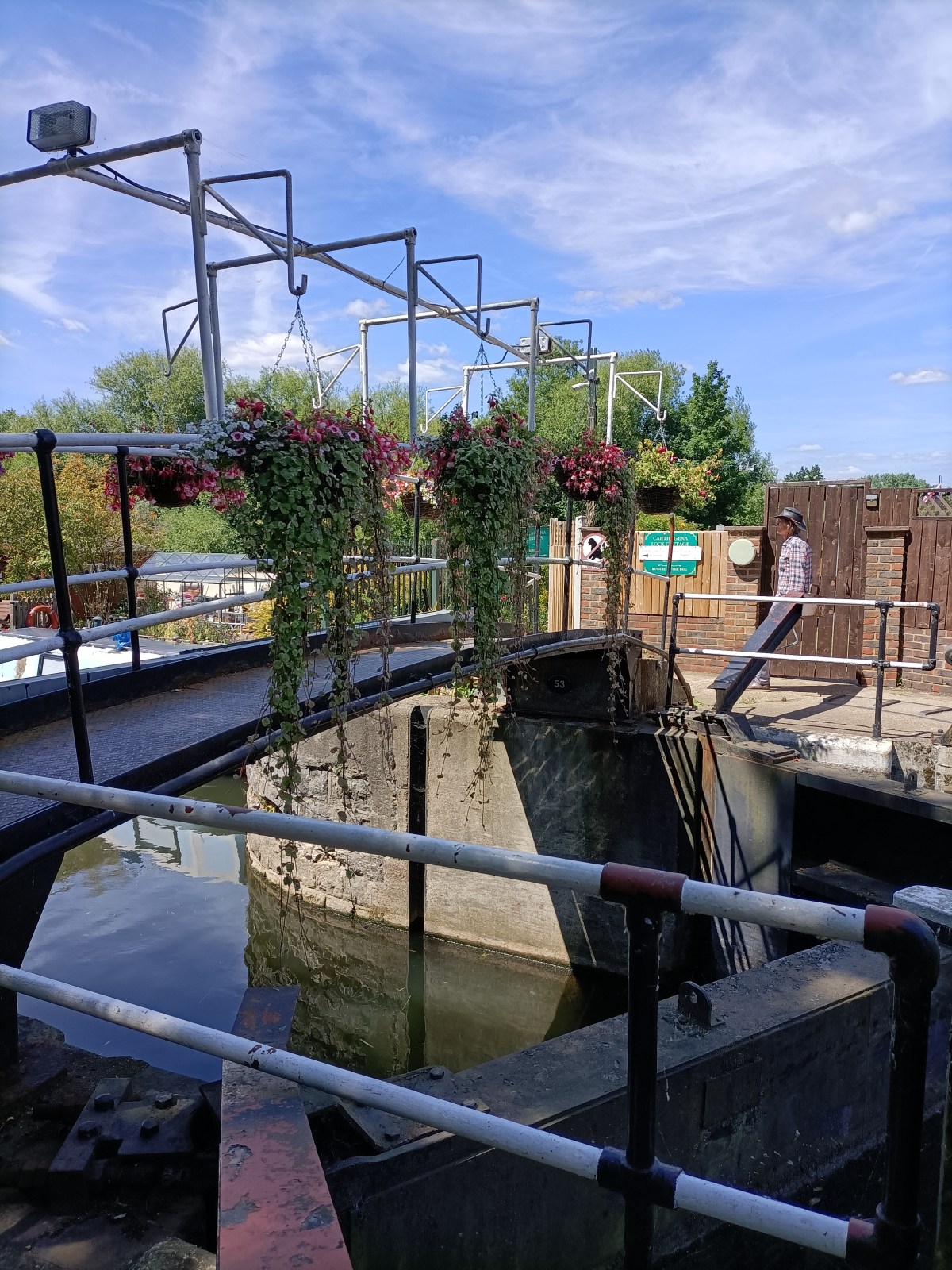 Unfortunately we couldn’t stay on the pub mooring overnight so reluctantly continued our journey, even though the moorings, according to the satellite view on Google maps, looked few and far between. The river was beautiful as it meandered along but there was little opportunity to moor as the banks were overgrown with weeds and too shallow to allow the boat to get close to the towpath. We passed the power station at Rye Park and R suggested we moor before the next lock. Easier said than done. Our first attempt banked us onto rocks which then entailed alot of reversing to regain the deeper centerline of the river. As we turned a corner, the lock immediately visible, there were a few boats moored on the right but it was obviously private mooring. On the left we decided we could just fit behind a narrowboat that looked rather abandoned and gingerly headed towards the bank. Somehow R managed to alight and then wanted me to attach our plank between the stern and the towpath but it wasn’t long enough. However we were able to fit the plank at the bow end, to my mind in a very precarious position. R said this would be good practice for when we travel the Kennett & Avon as the banks there are notoriously unkempt! Having walked the plank onto the boat I have no intention of using it again unless absolutely necessary!