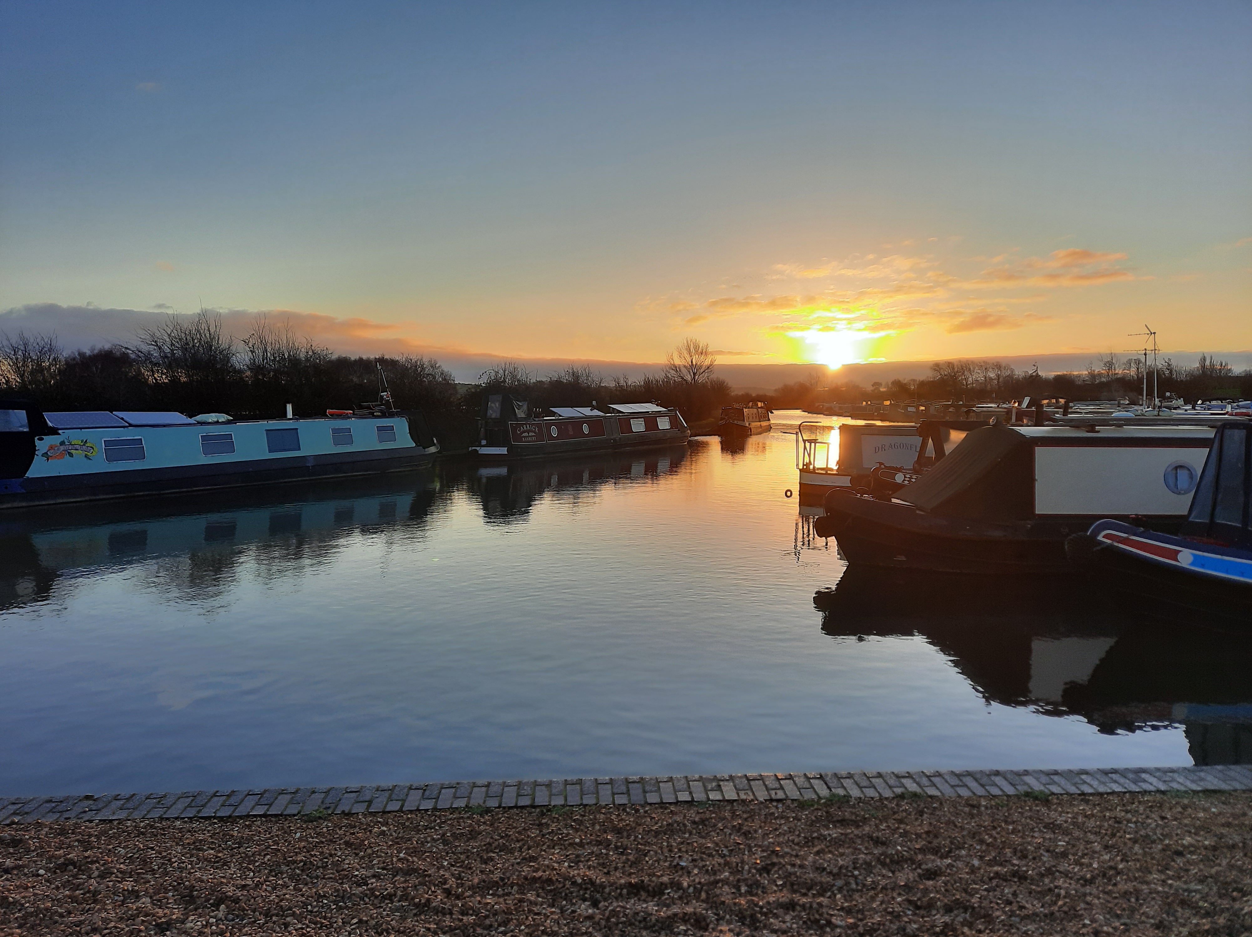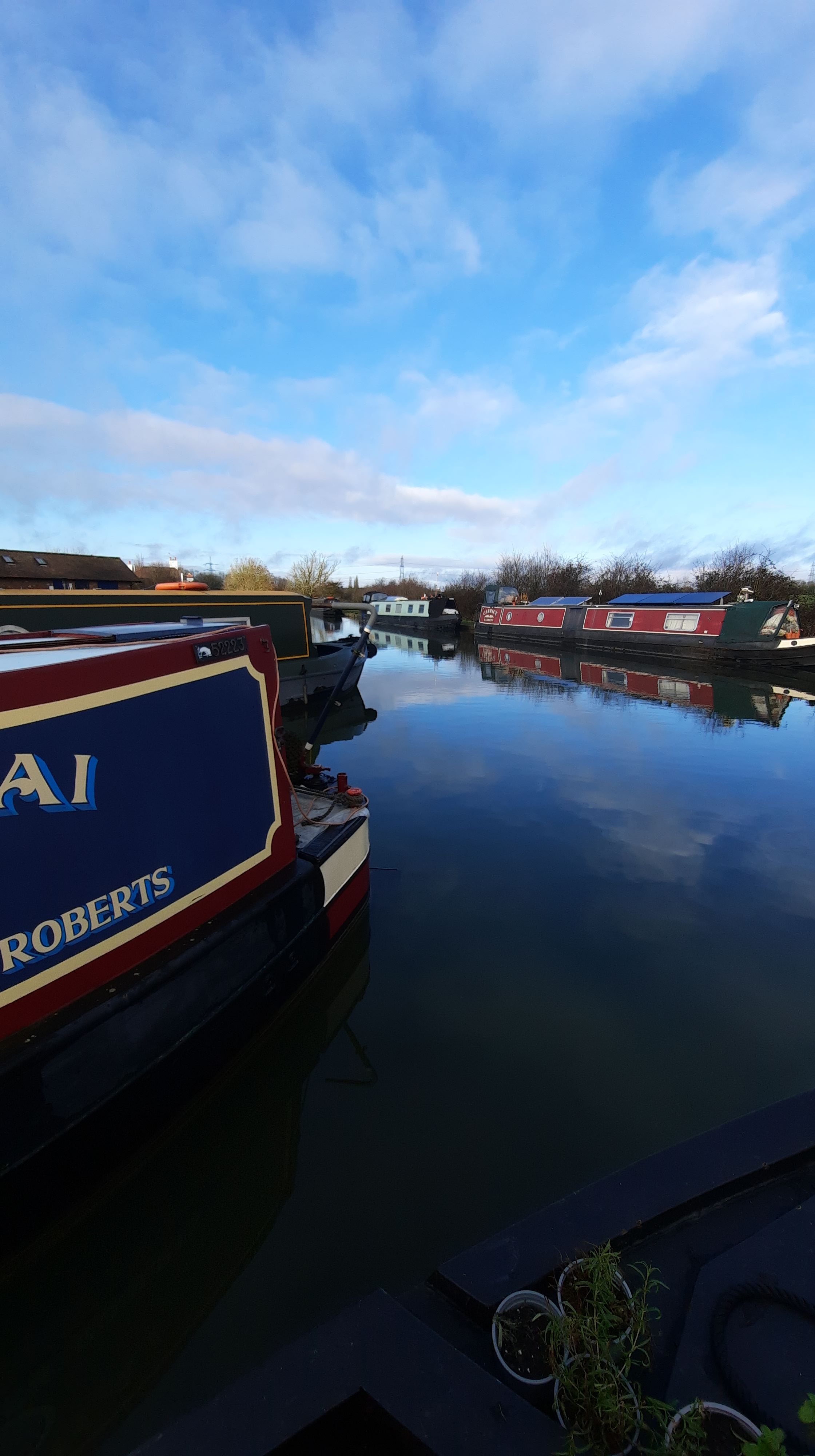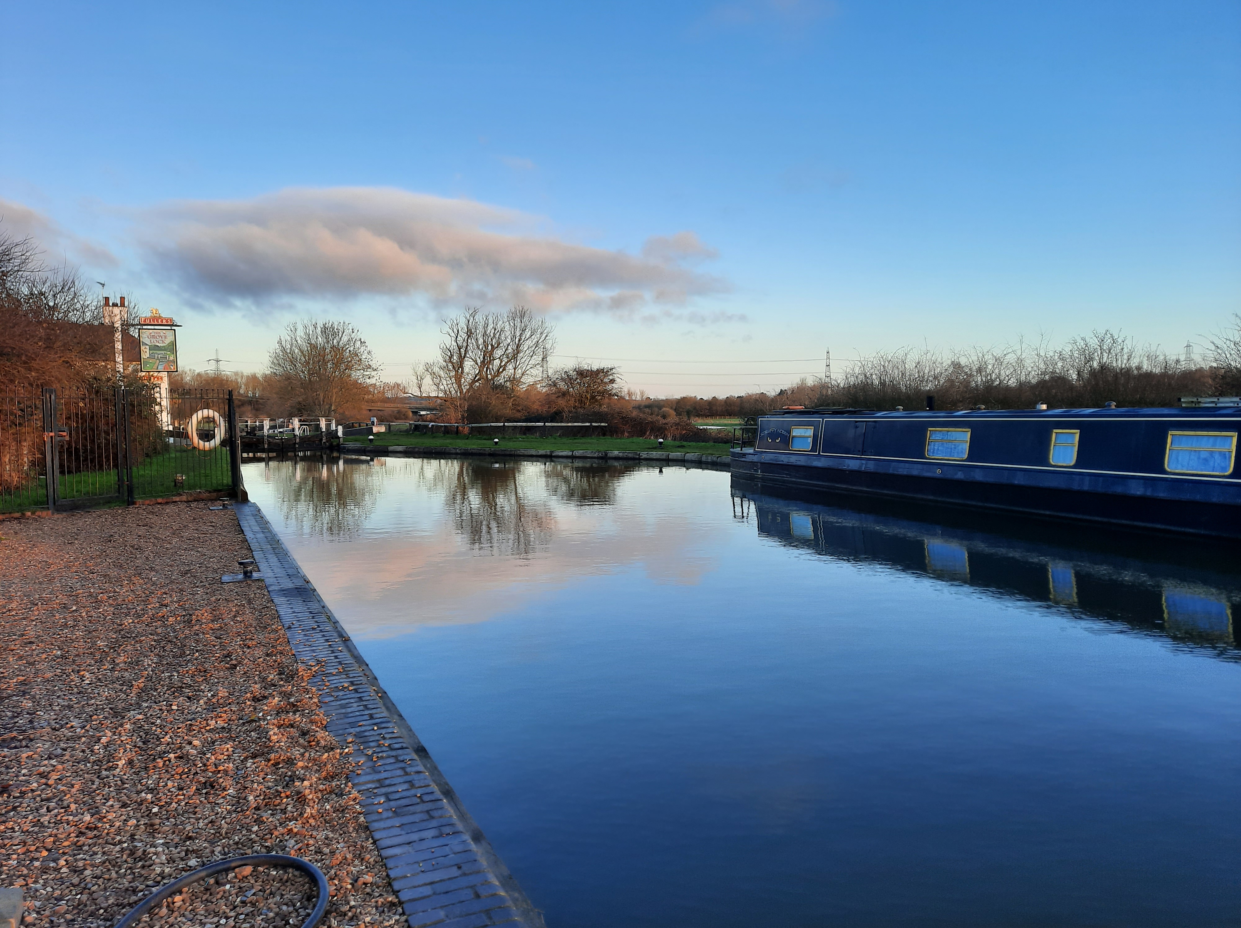 Interspersed with Zoom prayers and Zoom church followed by chat we managed to get all our chores completed including a satisfying pile of clean, dry laundry. The boat was vacuumed, cleaned, tidied and all ready for the off by midday. Having said our goodbyes to a very cheery group of narrowboaters (quite a few meandering outside because of the sunny, dry morning) R went to fill the lock as I started the engine and contemplated how I was going to exit the marina without damaging any of the smart boats surrounding me. S, our neighbour, gave me helpful tips and a push in the right direction but at the same time a widebeam passed by and I realised he would be the happy beneficiary of R’s filled lock! Our good deed for the day! As we were in no hurry it really didn’t matter although I had quite a job keeping the boat in a straight line whilst waiting for the lock to refill. Eventually I managed to moor it along the towpath and hold it by the midrope. There’s always a danger when waiting for a lock to fill, with the water pulling you in the direction of the gates, that you might end up straddling across the canal or gently banging in to another moored boat if one is nearby. The scenario playing out in my head this morning! Fortunately all went smoothly, we entered and left the lock and found a mooring within sight of an Aldi! Not quite as upmarket as our Waitrose moorings but Aldi do supply some good gin!